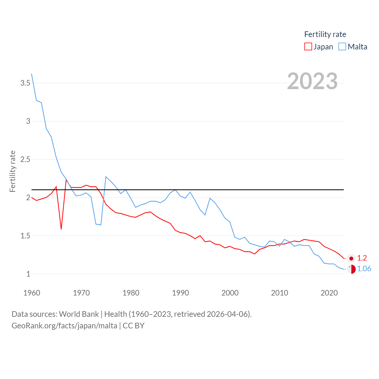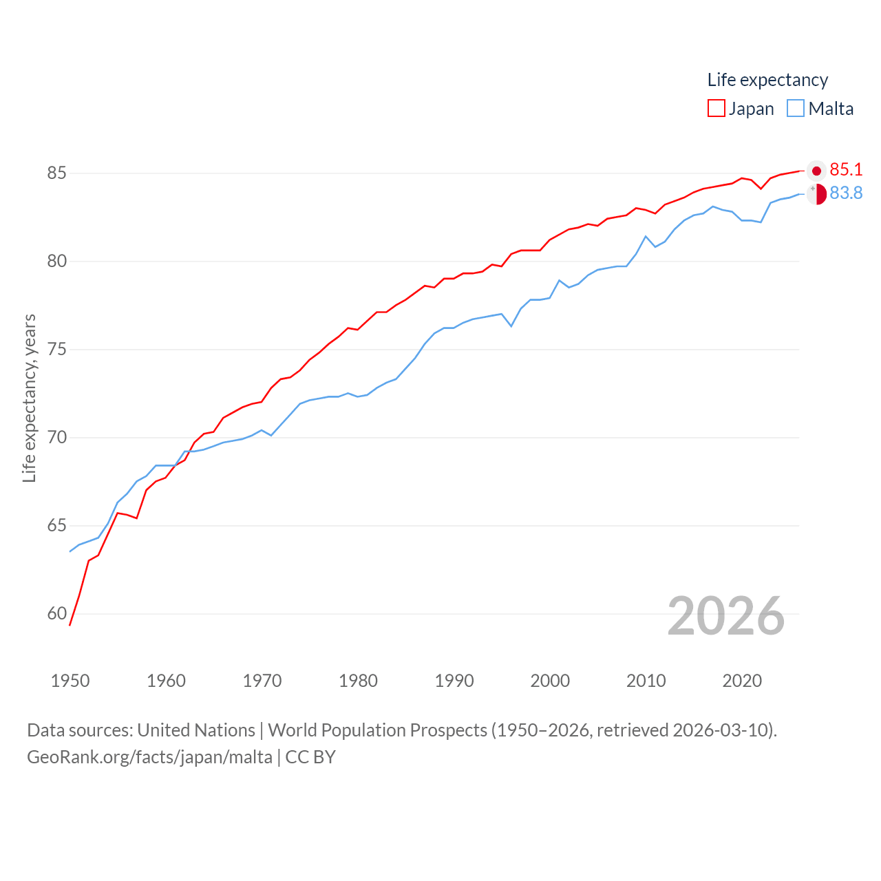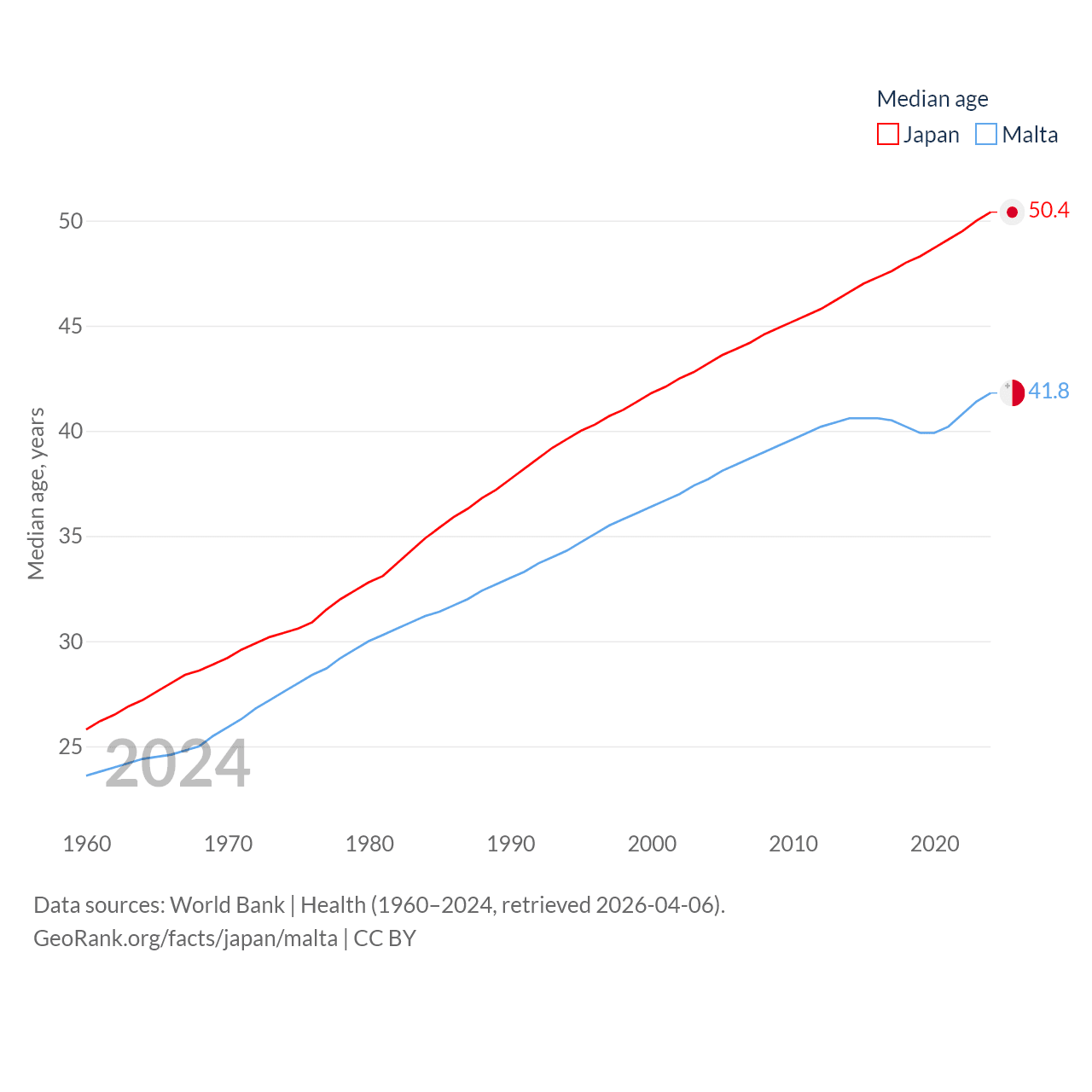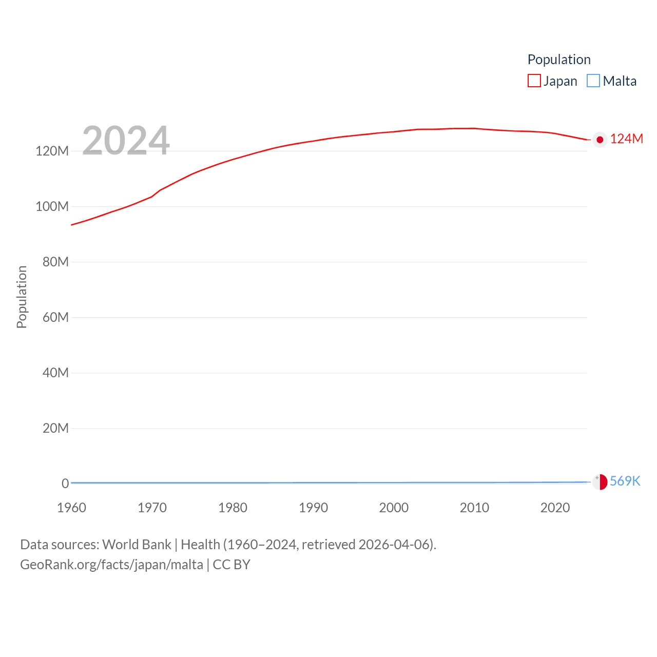Japan has a population of 124M (ranked 12/197), compared with 569K in Malta (ranked 167/197). Japan's land area is 140,761 sq mi versus 123.6 sq mi for Malta (ranked 61st vs. 187th).