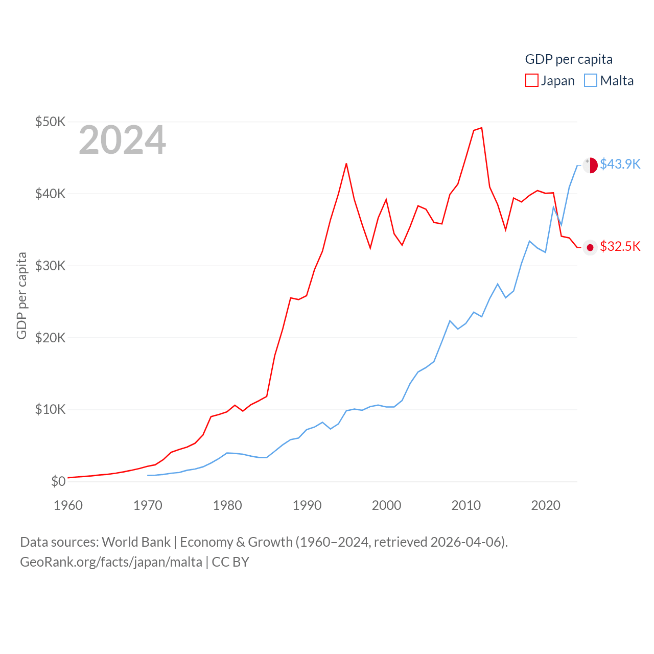 By GDP, Japan ranks 4/197 ($4.03T) and Malta ranks 119/197 ($25B). By GDP per capita, Japan ranks 38/197 ($32,487), while Malta ranks 28/197 ($43,899).