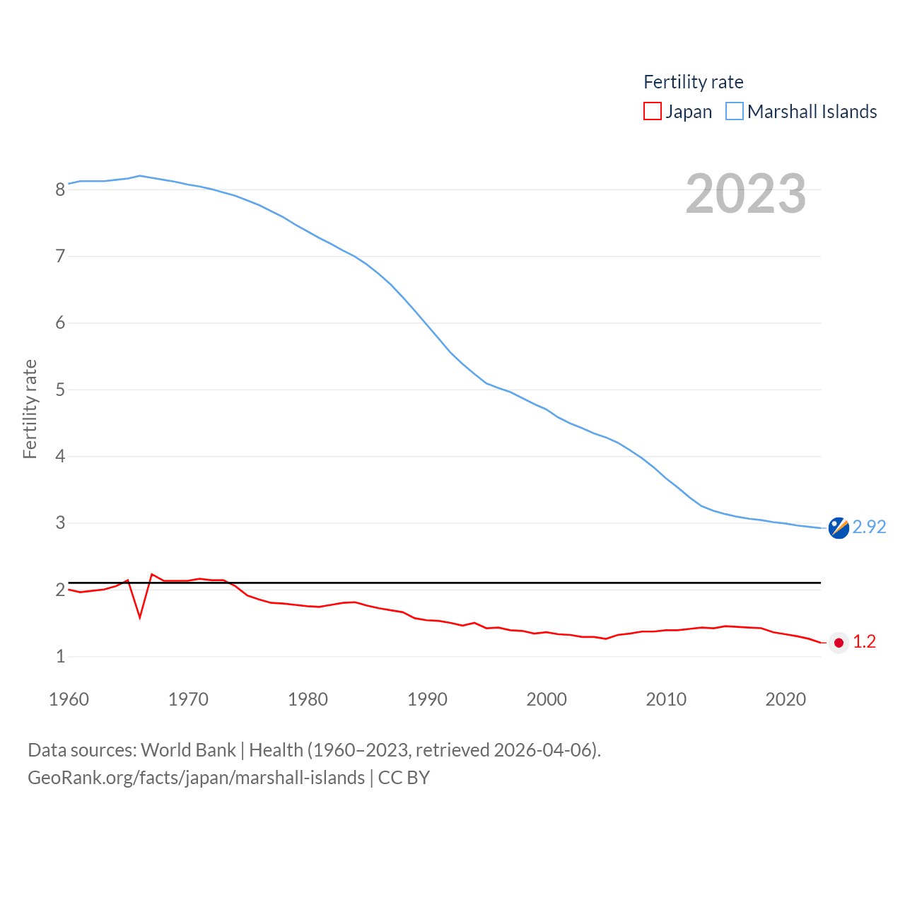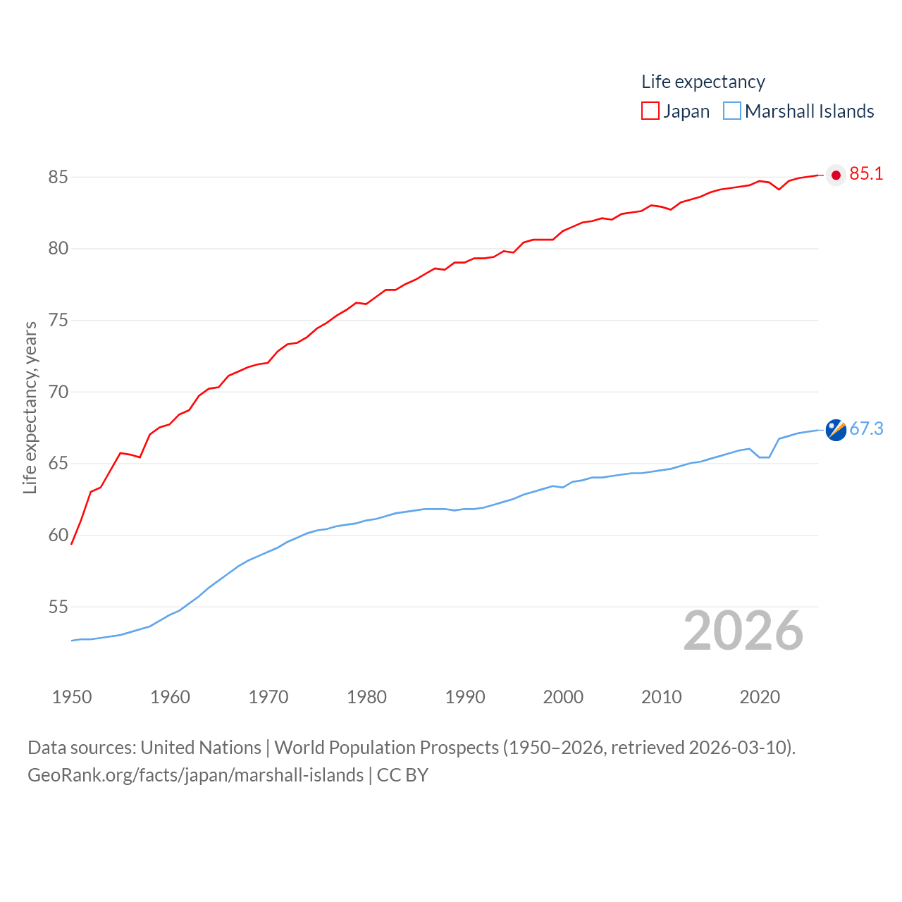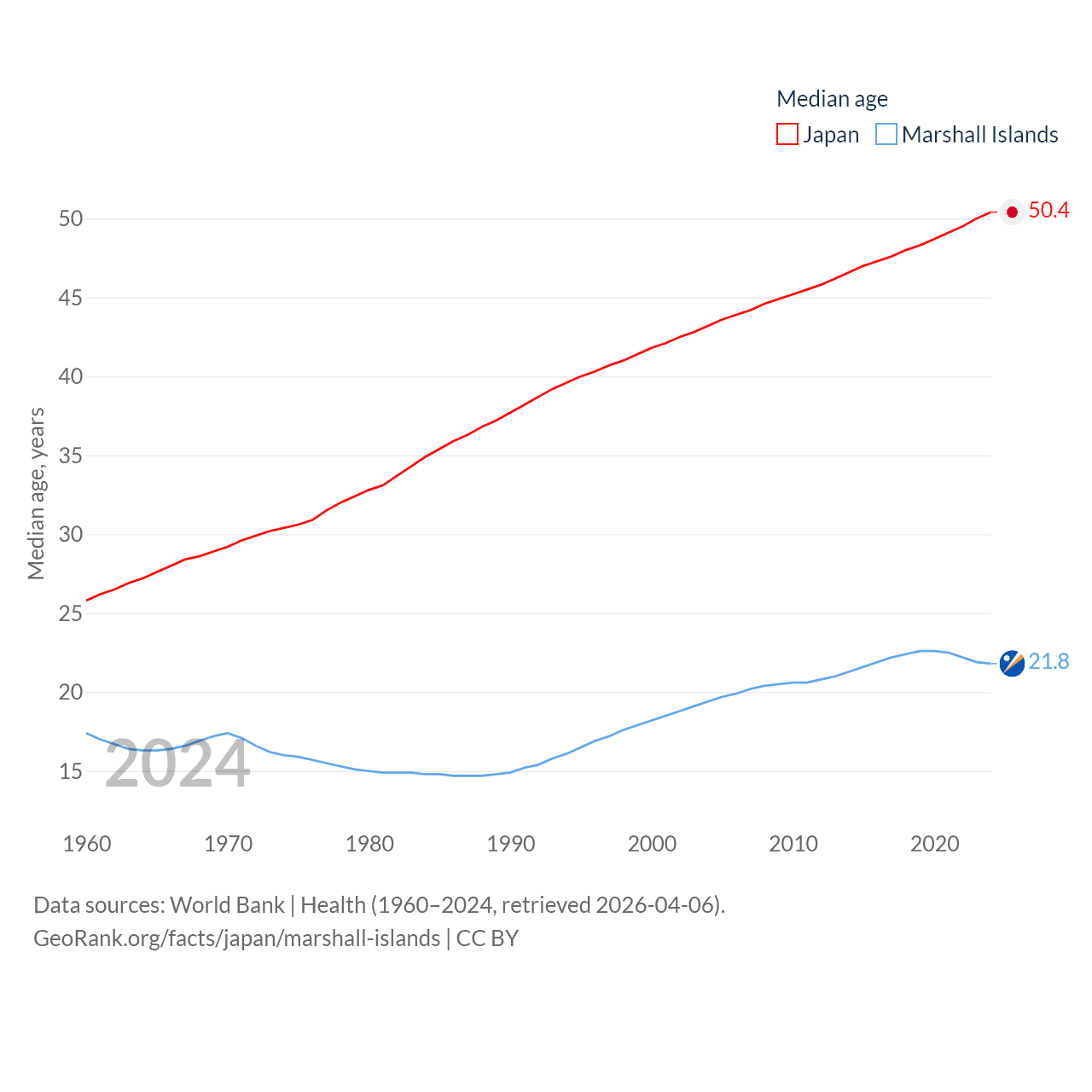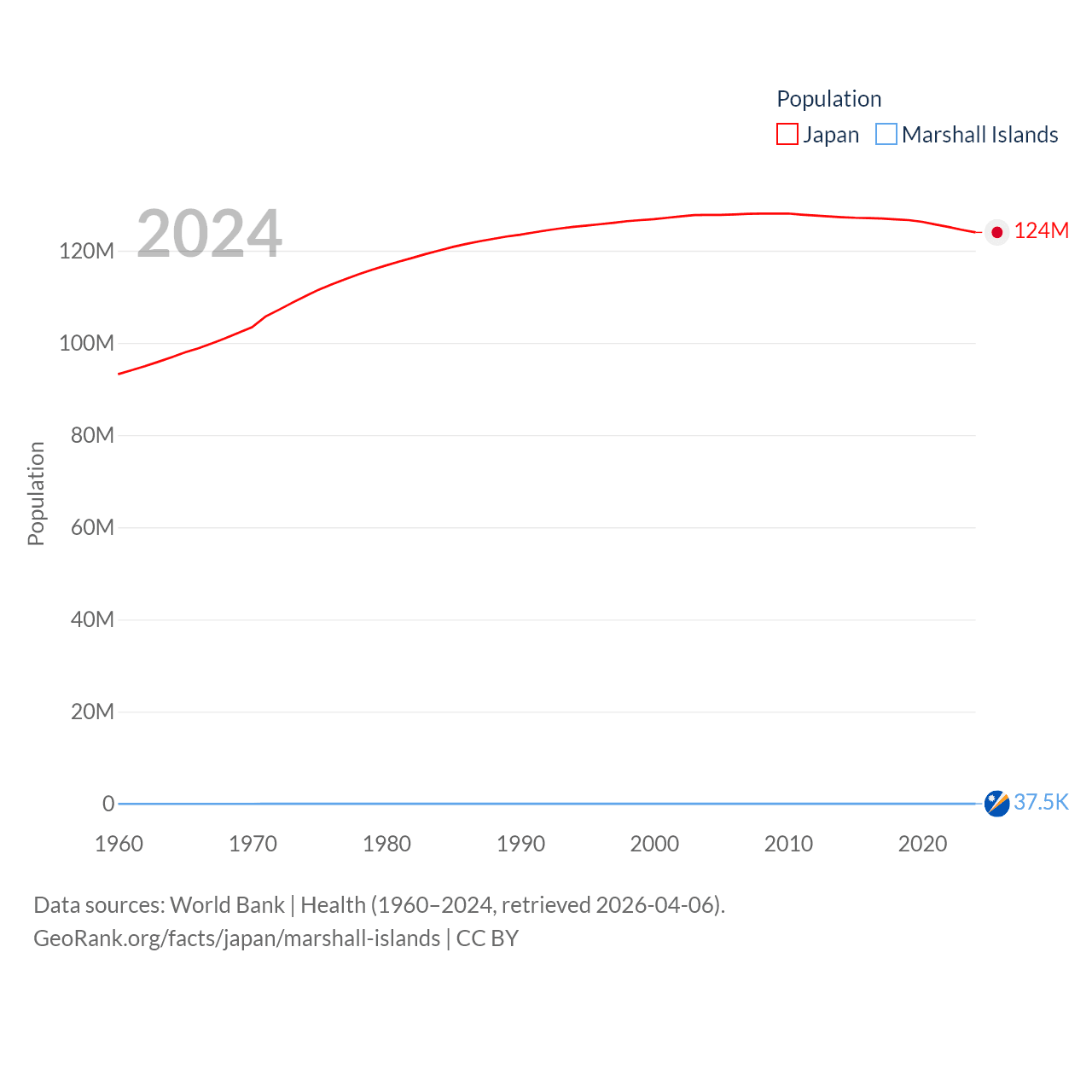 Japan has a population of 124M (ranked 12/197), compared with 37.5K in The Marshall Islands (ranked 192/197). Japan's land area is 140,761 sq mi versus 69.5 sq mi for The Marshall Islands (ranked 61st vs. 191st).