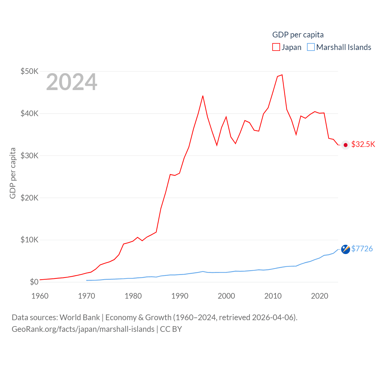 By GDP, Japan ranks 4/197 ($4.03T) and The Marshall Islands ranks 193/197 ($290M). By GDP per capita, Japan ranks 38/197 ($32,487), while The Marshall Islands ranks 96/197 ($7,726).
