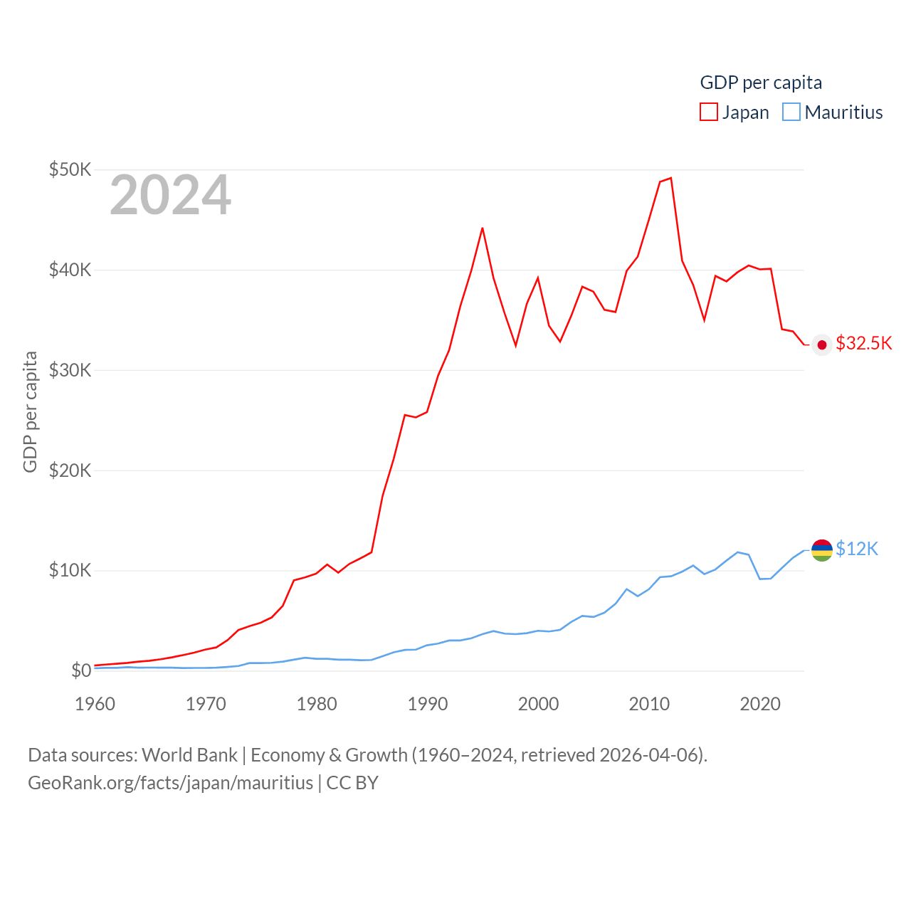By GDP, Japan ranks 4/197 ($4.03T) and Mauritius ranks 143/197 ($14.9B). By GDP per capita, Japan ranks 38/197 ($32,487), while Mauritius ranks 78/197 ($11,991).