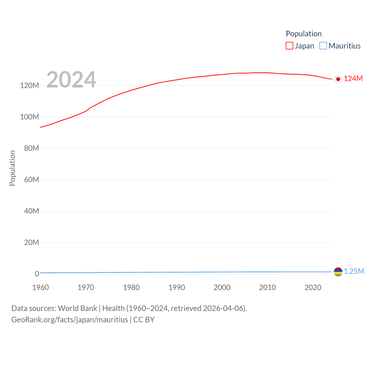 Japan has a population of 124M (ranked 12/197), compared with 1.25M in Mauritius (ranked 156/197). Japan's land area is 140,761 sq mi versus 771 sq mi for Mauritius (ranked 61st vs. 170th).