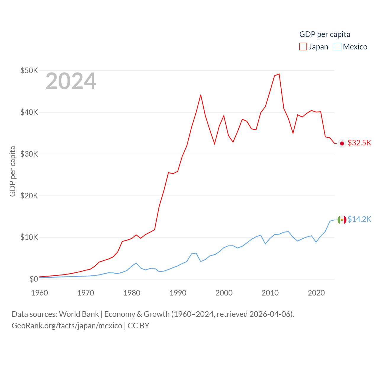 By GDP, Japan ranks 4/197 ($4.03T) and Mexico ranks 13/197 ($1.86T). By GDP per capita, Japan ranks 38/197 ($32,487), while Mexico ranks 69/197 ($14,186).