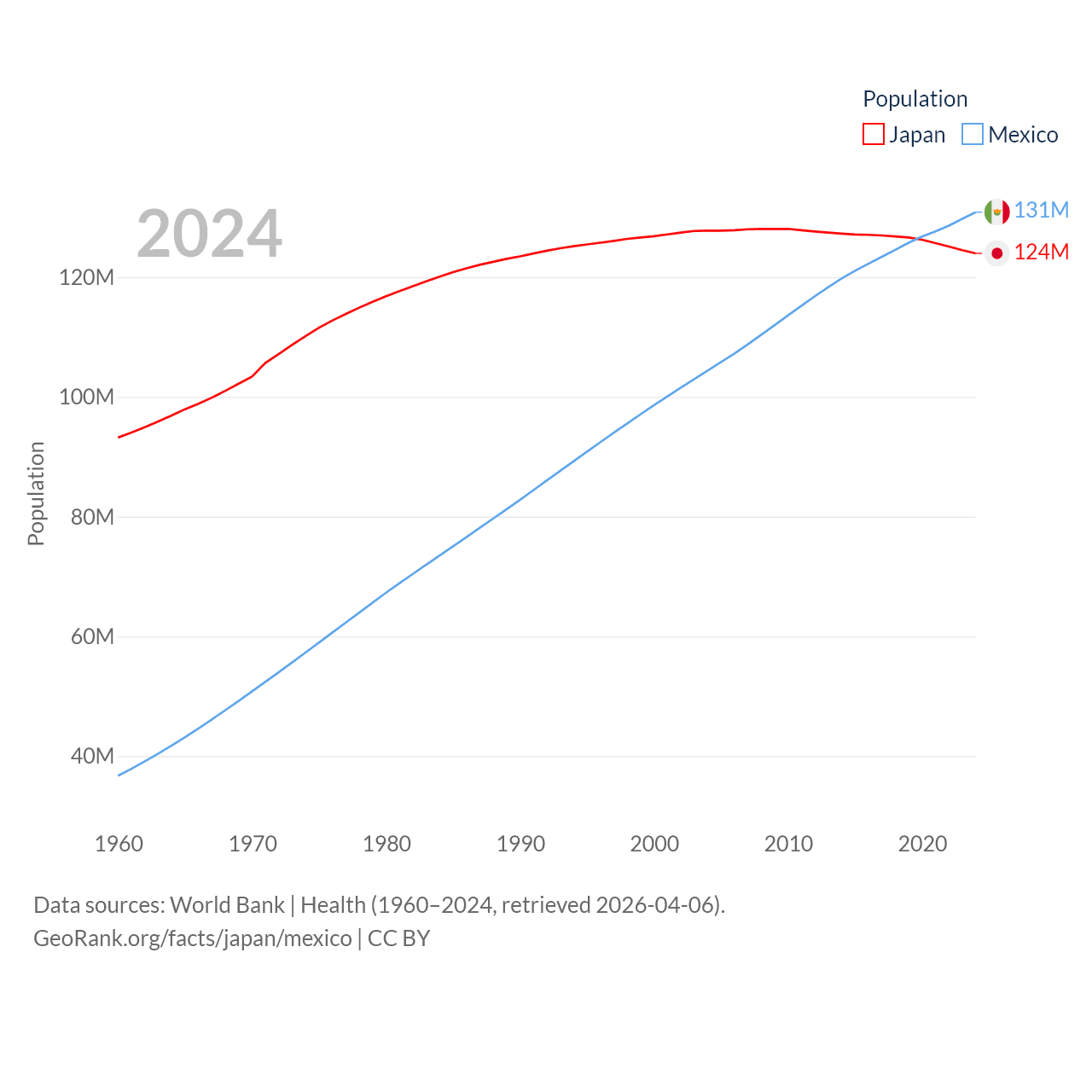 Japan has a population of 124M (ranked 12/197), compared with 131M in Mexico (ranked 11/197). Japan's land area is 140,761 sq mi versus 750,563 sq mi for Mexico (ranked 61st vs. 13th).