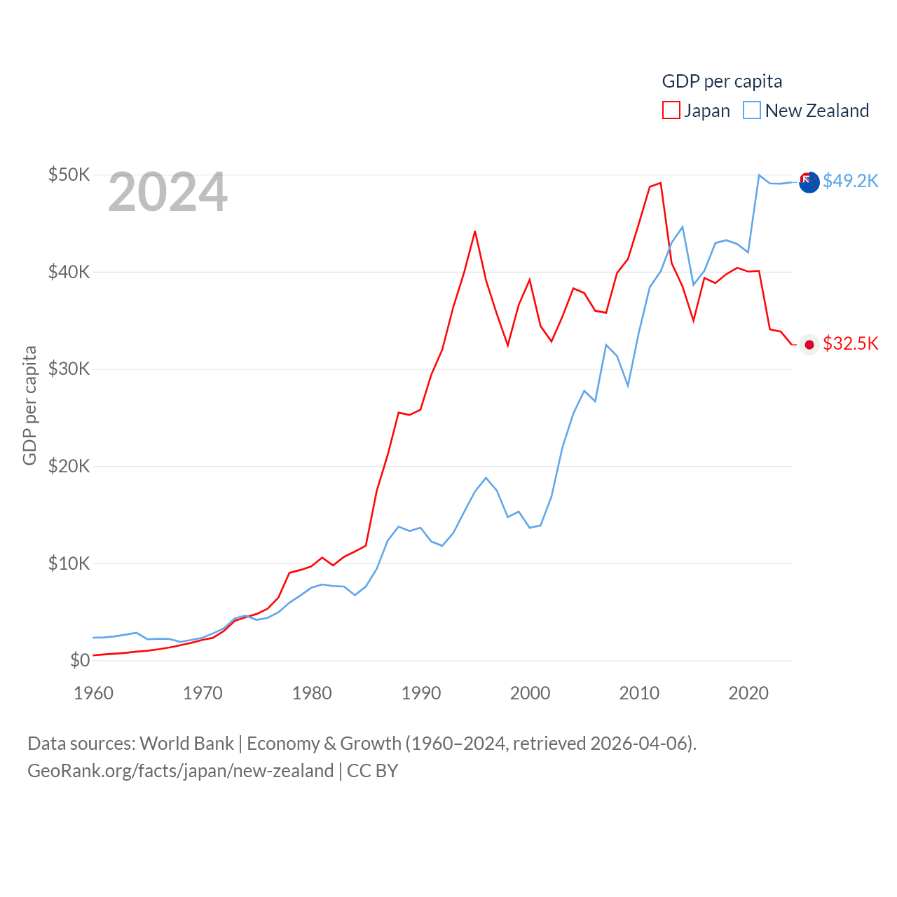 By GDP, Japan ranks 4/197 ($4.03T) and New Zealand ranks 52/197 ($260B). By GDP per capita, Japan ranks 38/197 ($32,487), while New Zealand ranks 26/197 ($49,205).