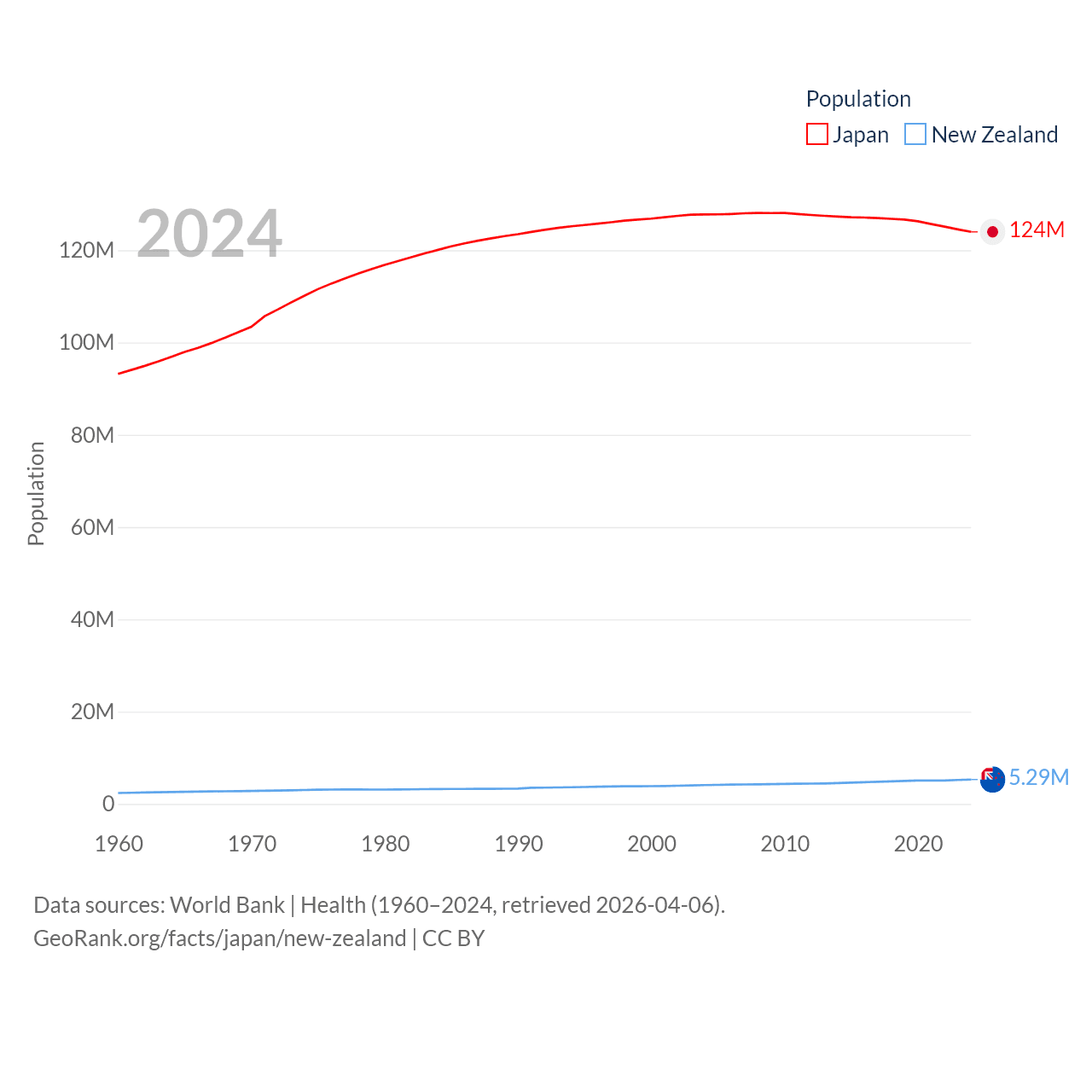 Japan has a population of 124M (ranked 12/197), compared with 5.29M in New Zealand (ranked 123/197). Japan's land area is 140,761 sq mi versus 101,665 sq mi for New Zealand (ranked 61st vs. 74th).