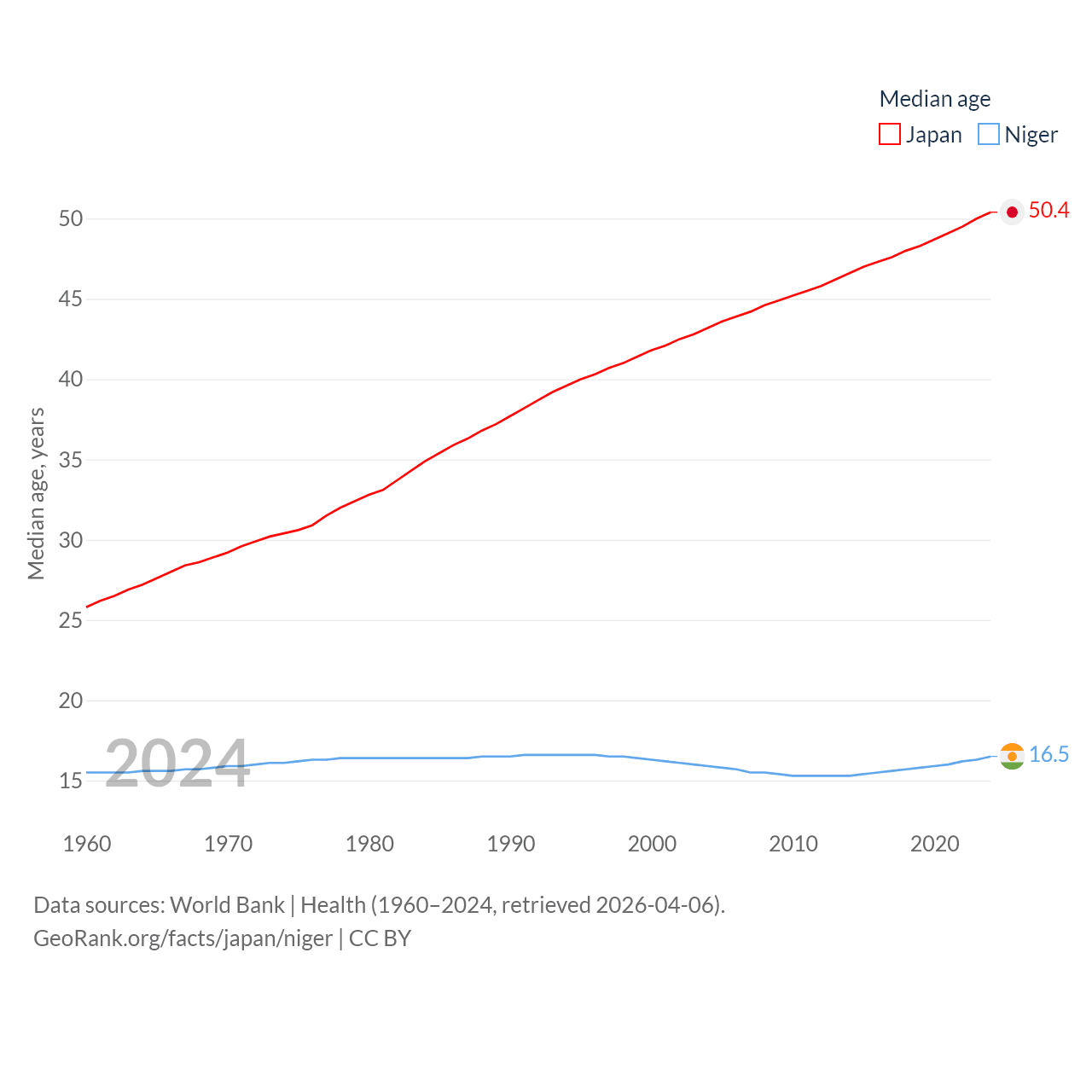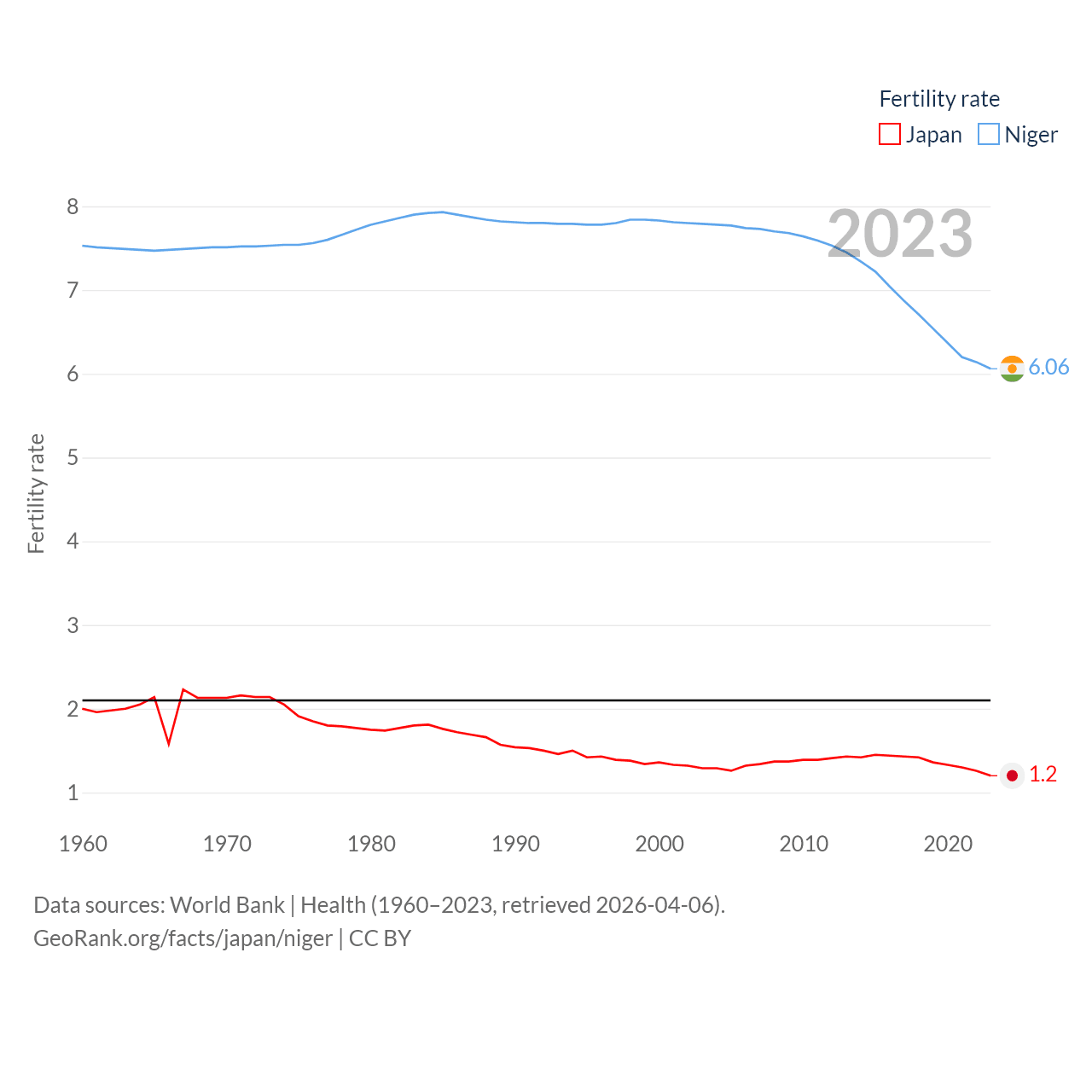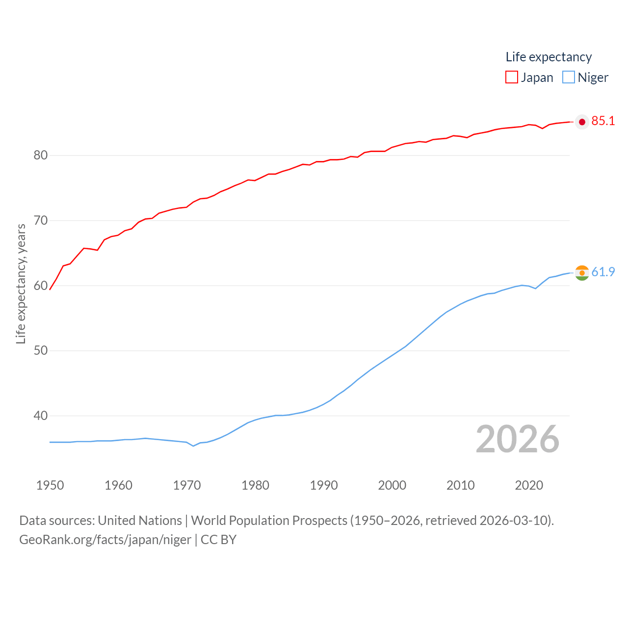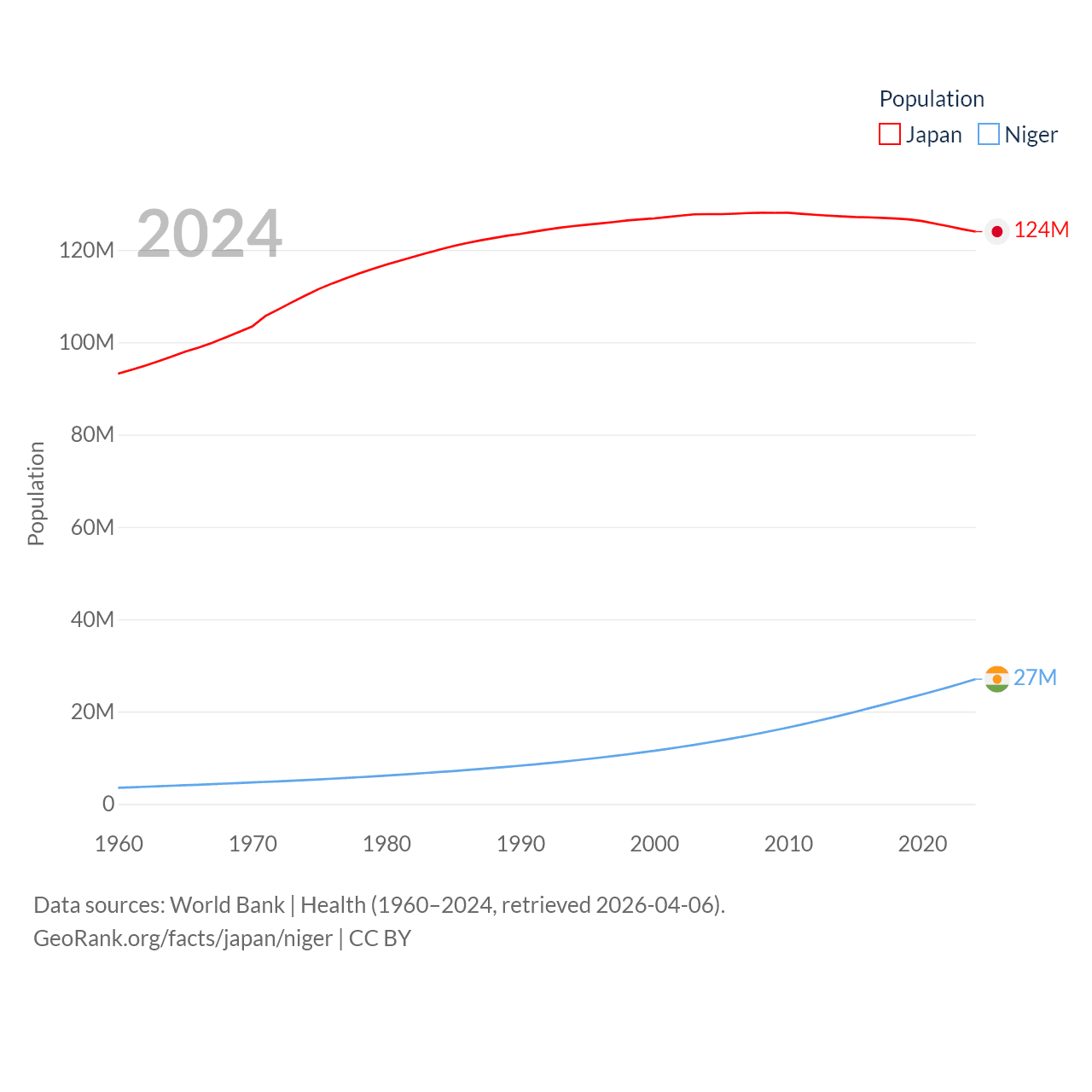Japan has a population of 124M (ranked 12/197), compared with 27M in Niger (ranked 55/197). Japan's land area is 140,761 sq mi versus 489,076 sq mi for Niger (ranked 61st vs. 20th).