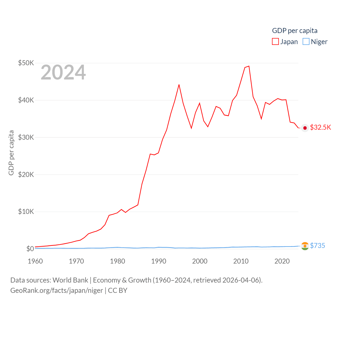 By GDP, Japan ranks 4/197 ($4.03T) and Niger ranks 130/197 ($19.9B). By GDP per capita, Japan ranks 38/197 ($32,487), while Niger ranks 187/197 ($735).