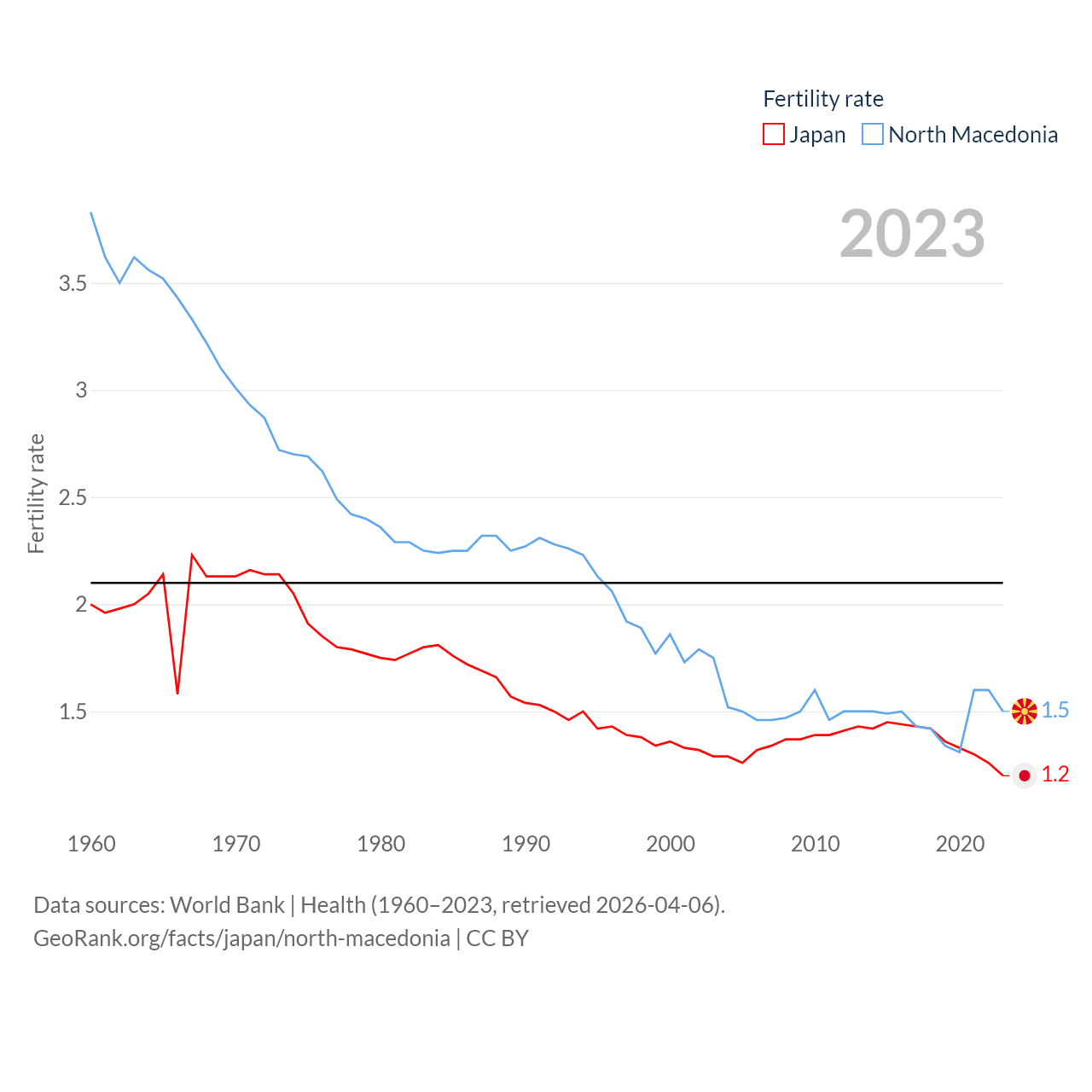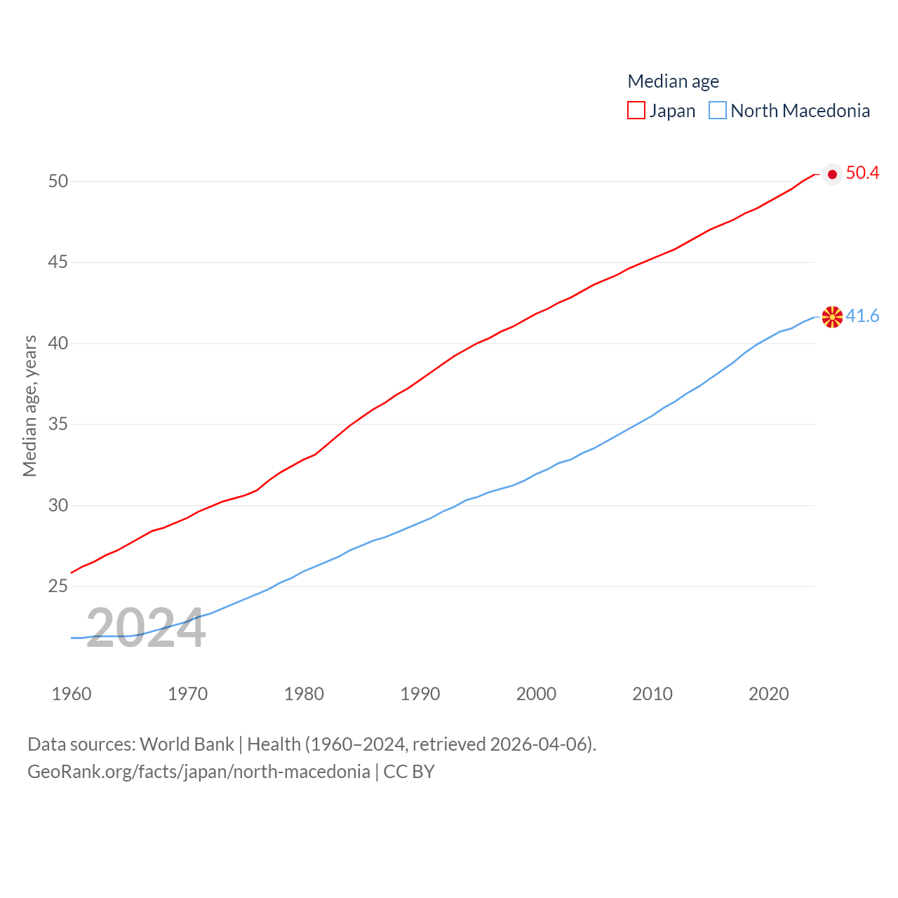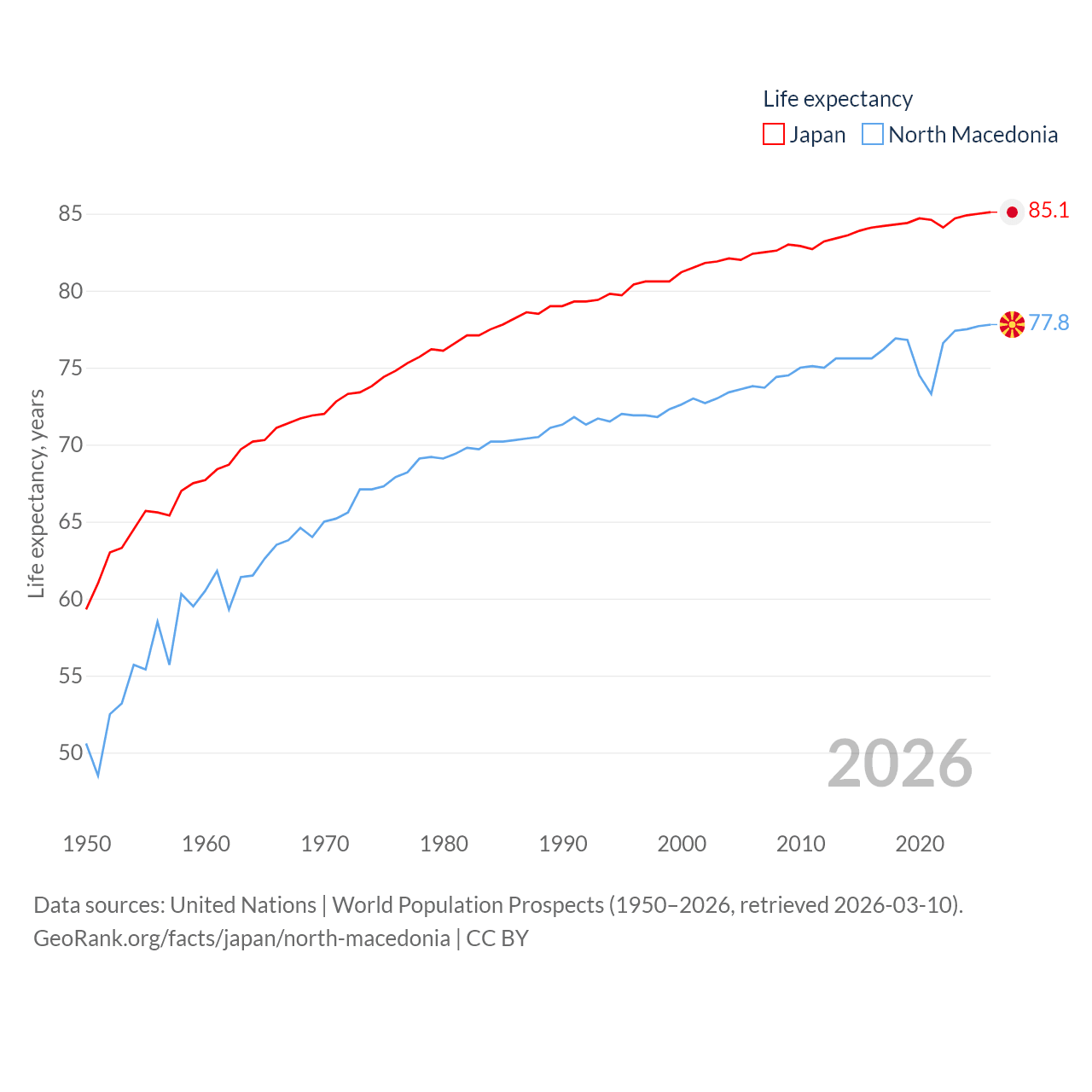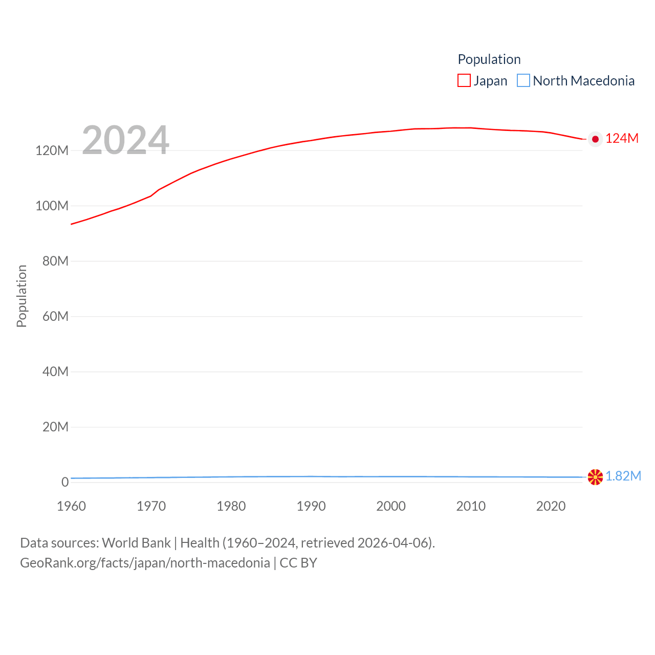 Japan has a population of 124M (ranked 12/197), compared with 1.82M in North Macedonia (ranked 150/197). Japan's land area is 140,761 sq mi versus 9,737 sq mi for North Macedonia (ranked 61st vs. 145th).