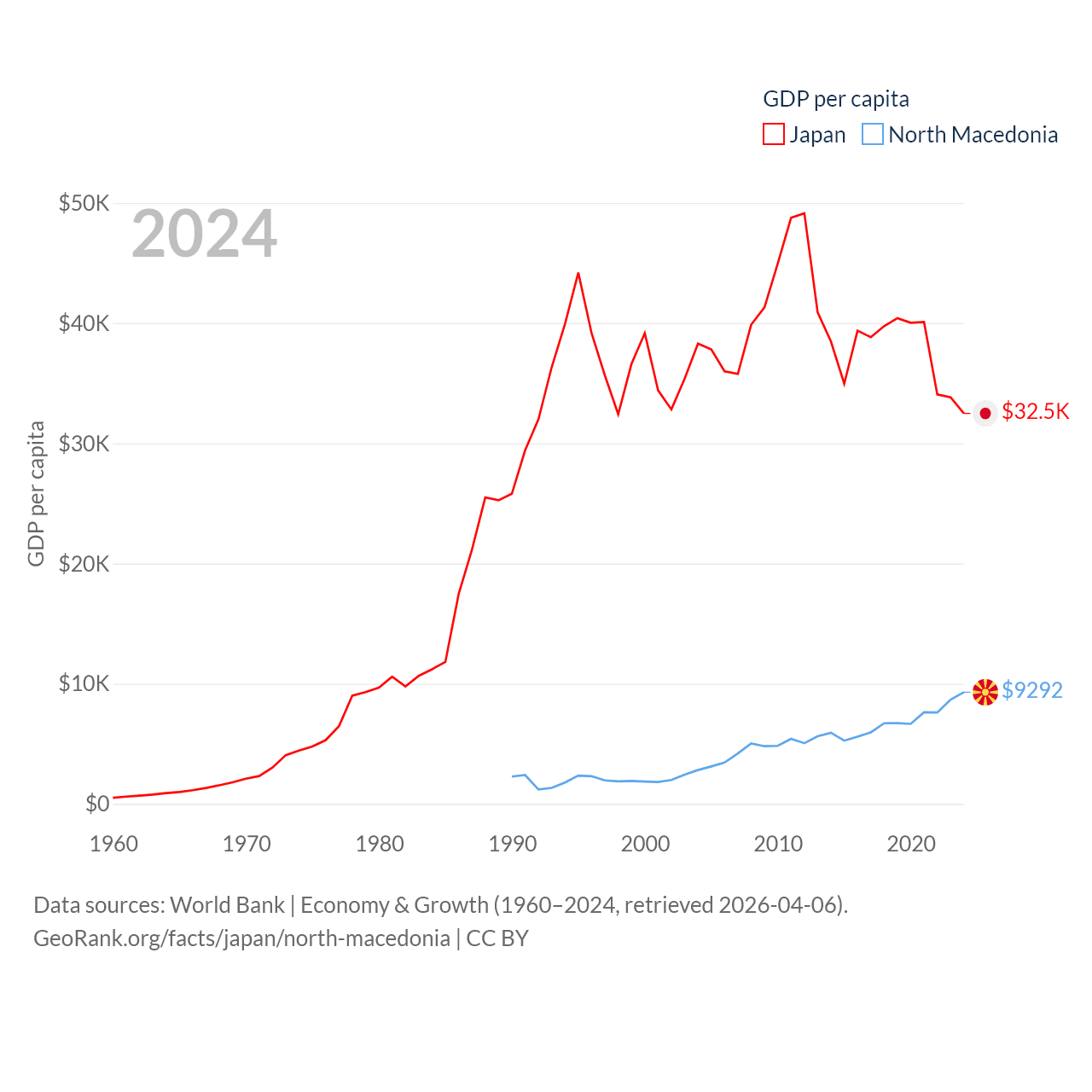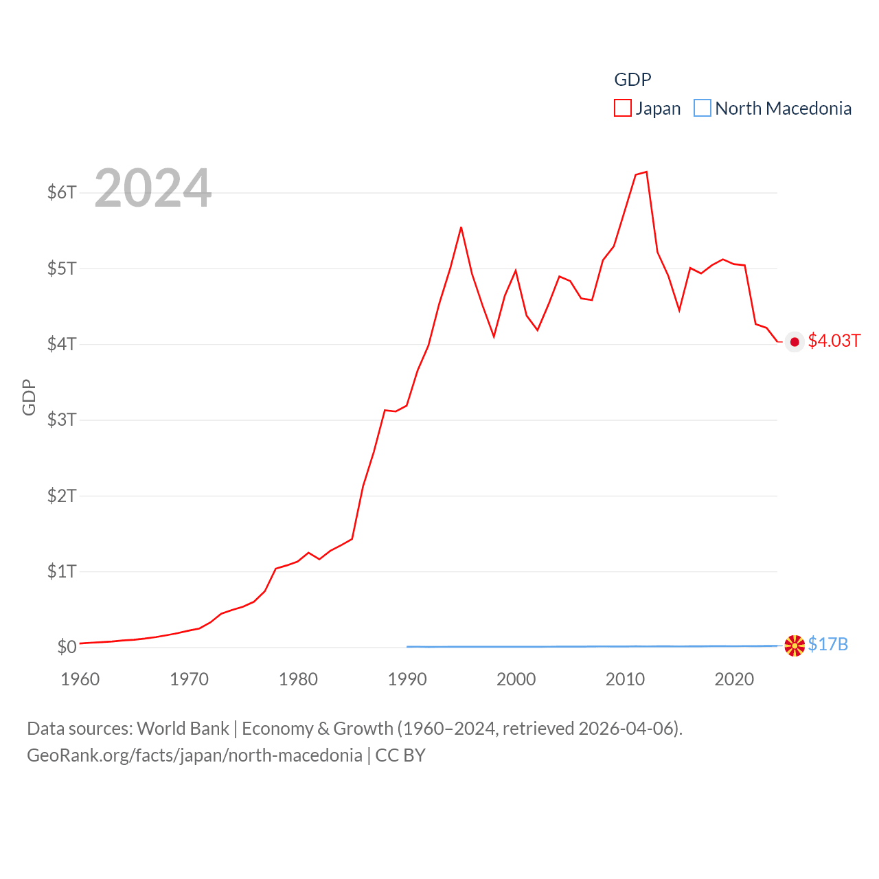 By GDP, Japan ranks 4/197 ($4.03T) and North Macedonia ranks 138/197 ($17B). By GDP per capita, Japan ranks 38/197 ($32,487), while North Macedonia ranks 88/197 ($9,292).