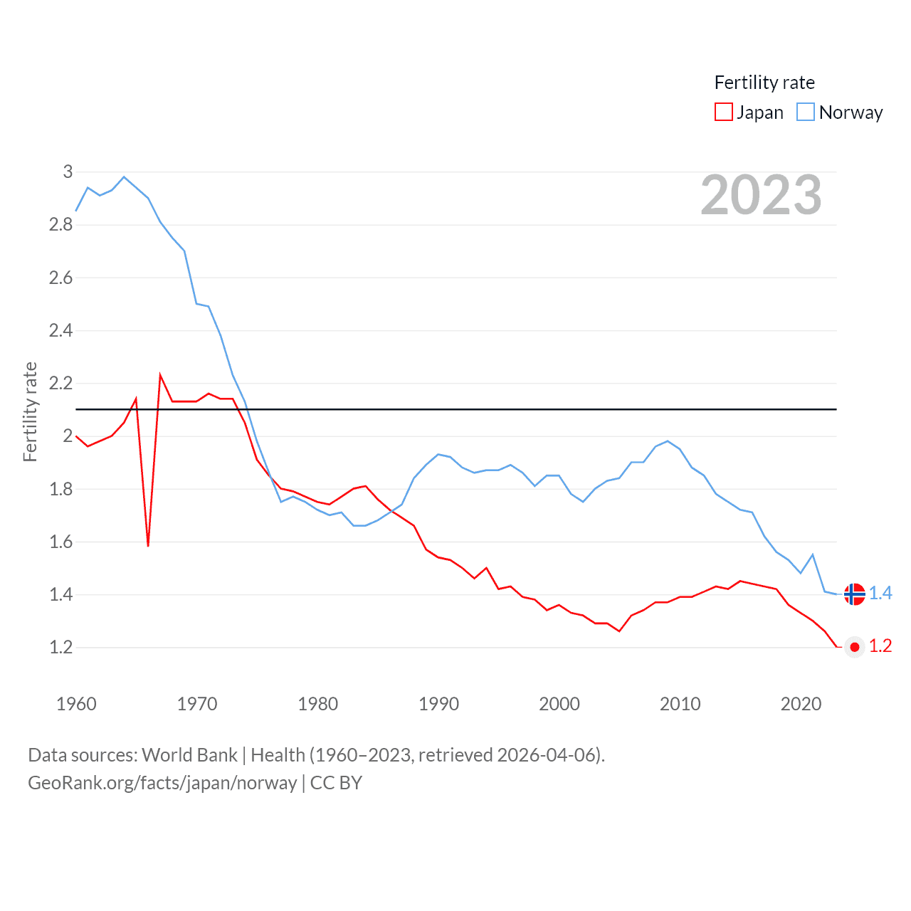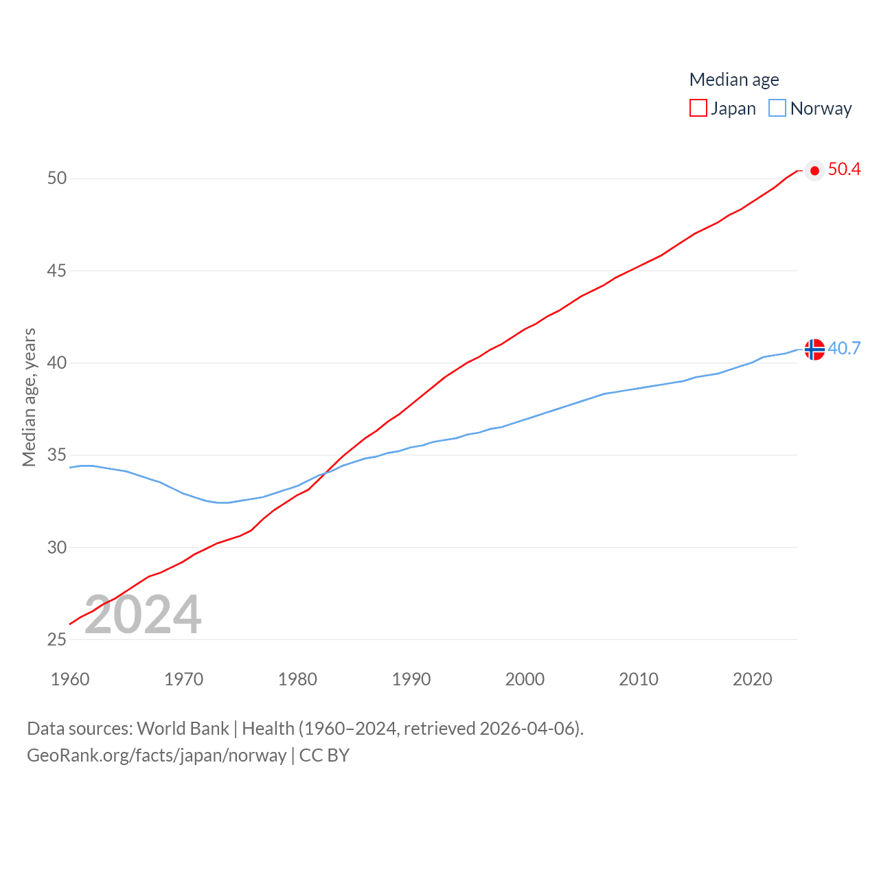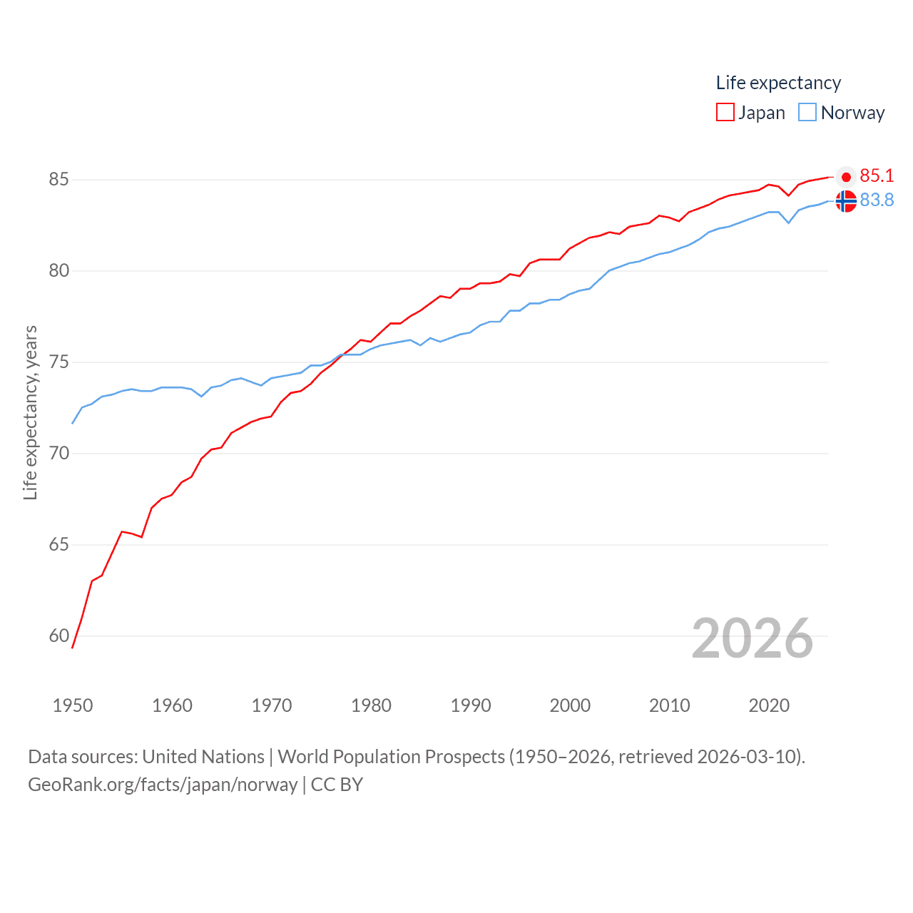 Japan has a population of 124M (ranked 12/197), compared with 5.57M in Norway (ranked 118/197). Japan's land area is 140,761 sq mi versus 140,645 sq mi for Norway (ranked 61st vs. 62nd).