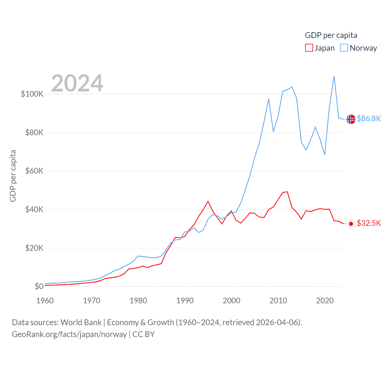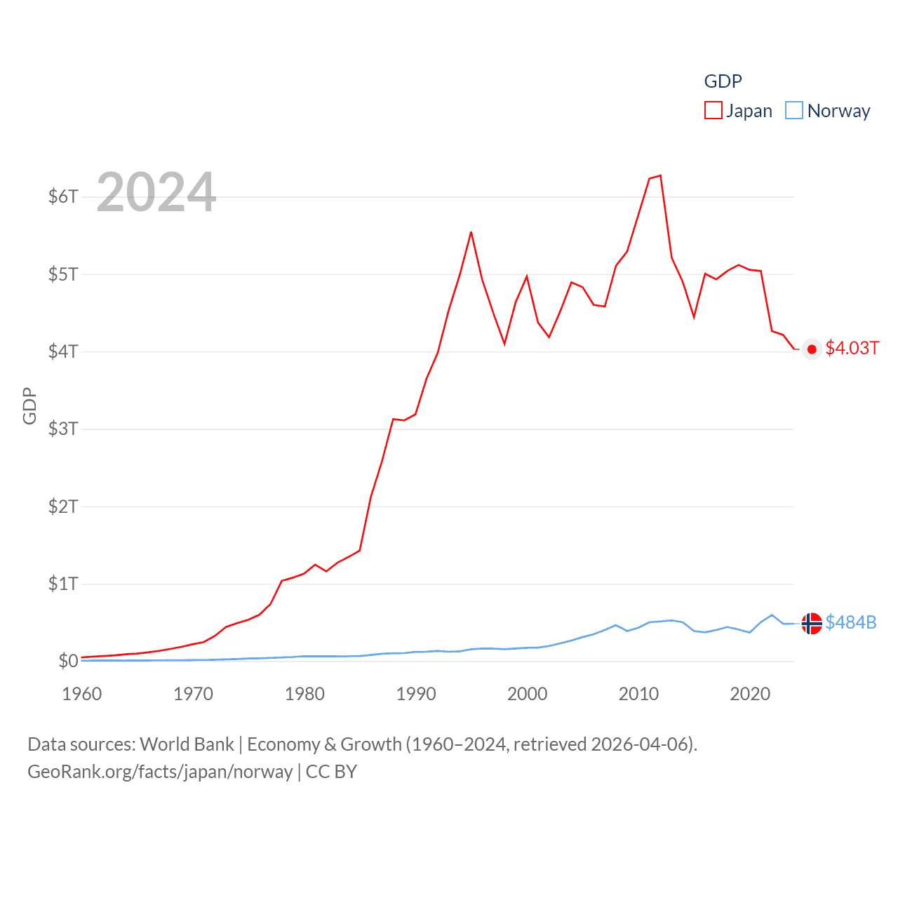 By GDP, Japan ranks 4/197 ($4.03T) and Norway ranks 32/197 ($484B). By GDP per capita, Japan ranks 38/197 ($32,487), while Norway ranks 8/197 ($86,785).