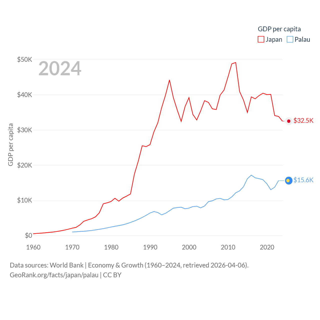By GDP, Japan ranks 4/197 ($4.03T) and Palau ranks 194/197 ($277M). By GDP per capita, Japan ranks 38/197 ($32,487), while Palau ranks 67/197 ($15,611).