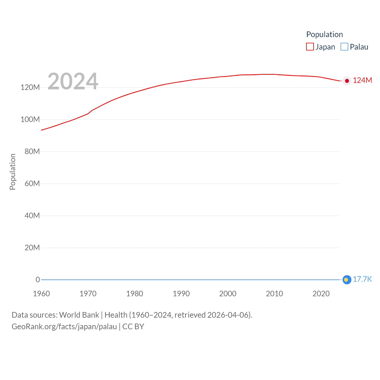 Japan has a population of 124M (ranked 12/197), compared with 17.7K in Palau (ranked 194/197). Japan's land area is 140,761 sq mi versus 177.6 sq mi for Palau (ranked 61st vs. 180th).
