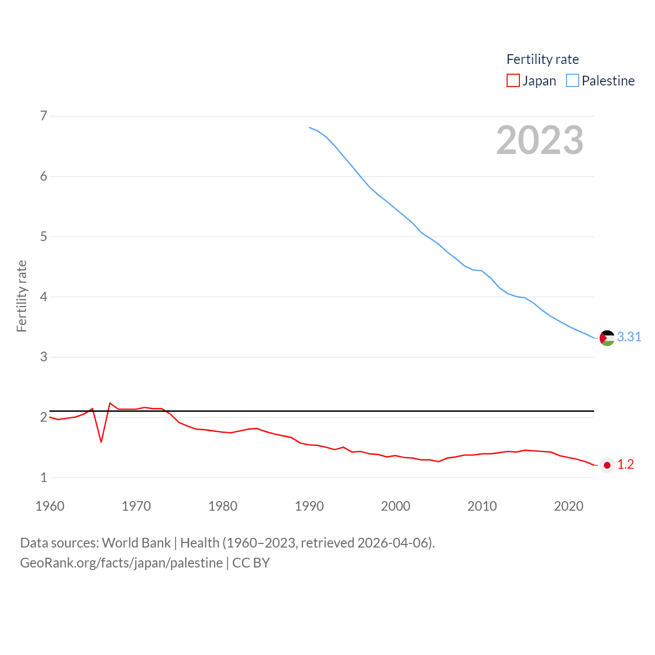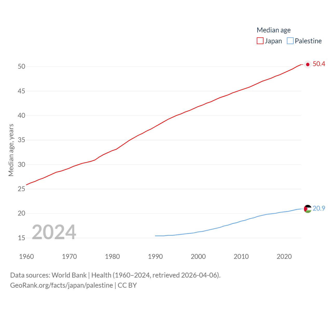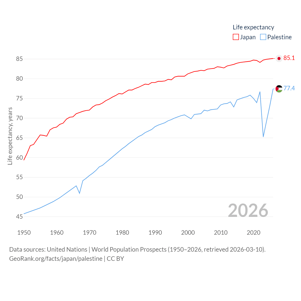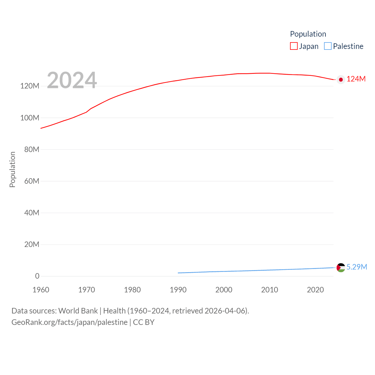 Japan has a population of 124M (ranked 12/197), compared with 5.29M in Palestine (ranked 122/197). Japan's land area is 140,761 sq mi versus 2,326 sq mi for Palestine (ranked 61st vs. 164th).