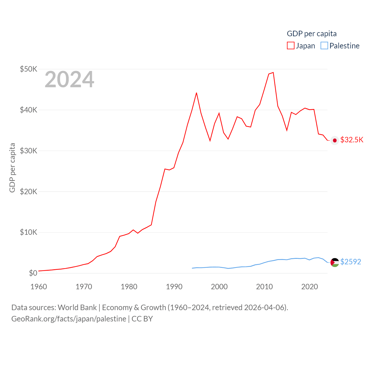 By GDP, Japan ranks 4/197 ($4.03T) and Palestine ranks 146/197 ($13.7B). By GDP per capita, Japan ranks 38/197 ($32,487), while Palestine ranks 147/197 ($2,592).