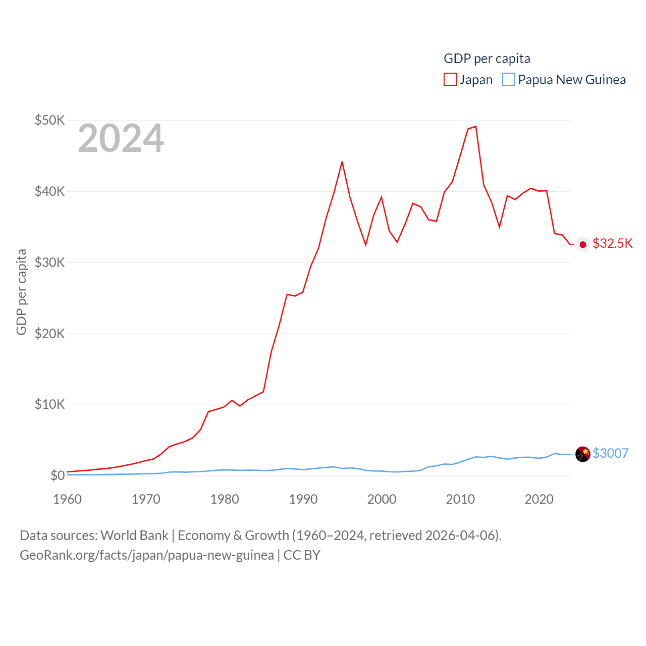 By GDP, Japan ranks 4/197 ($4.03T) and Papua New Guinea ranks 110/197 ($31.8B). By GDP per capita, Japan ranks 38/197 ($32,487), while Papua New Guinea ranks 140/197 ($3,007).
