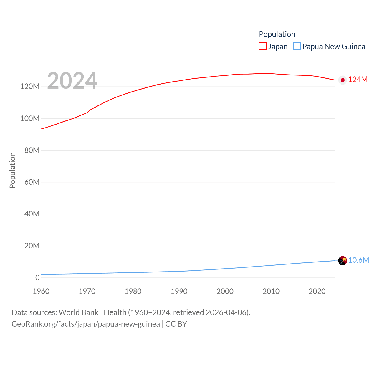 Japan has a population of 124M (ranked 12/197), compared with 10.6M in Papua New Guinea (ranked 92/197). Japan's land area is 140,761 sq mi versus 174,850 sq mi for Papua New Guinea (ranked 61st vs. 54th).
