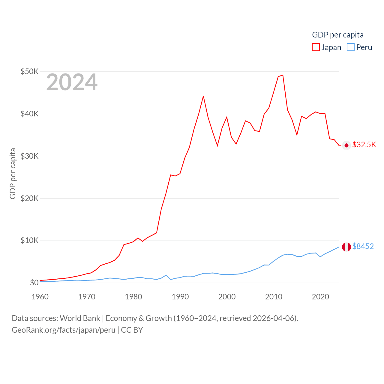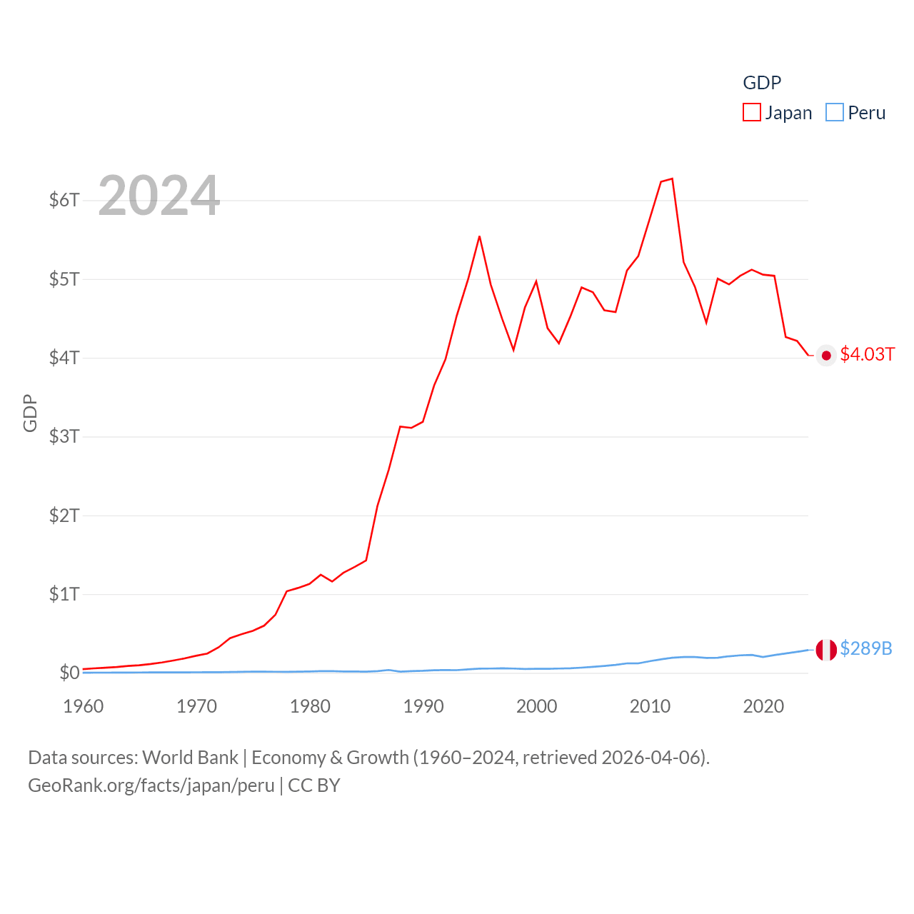By GDP, Japan ranks 4/197 ($4.03T) and Peru ranks 49/197 ($289B). By GDP per capita, Japan ranks 38/197 ($32,487), while Peru ranks 91/197 ($8,452).
