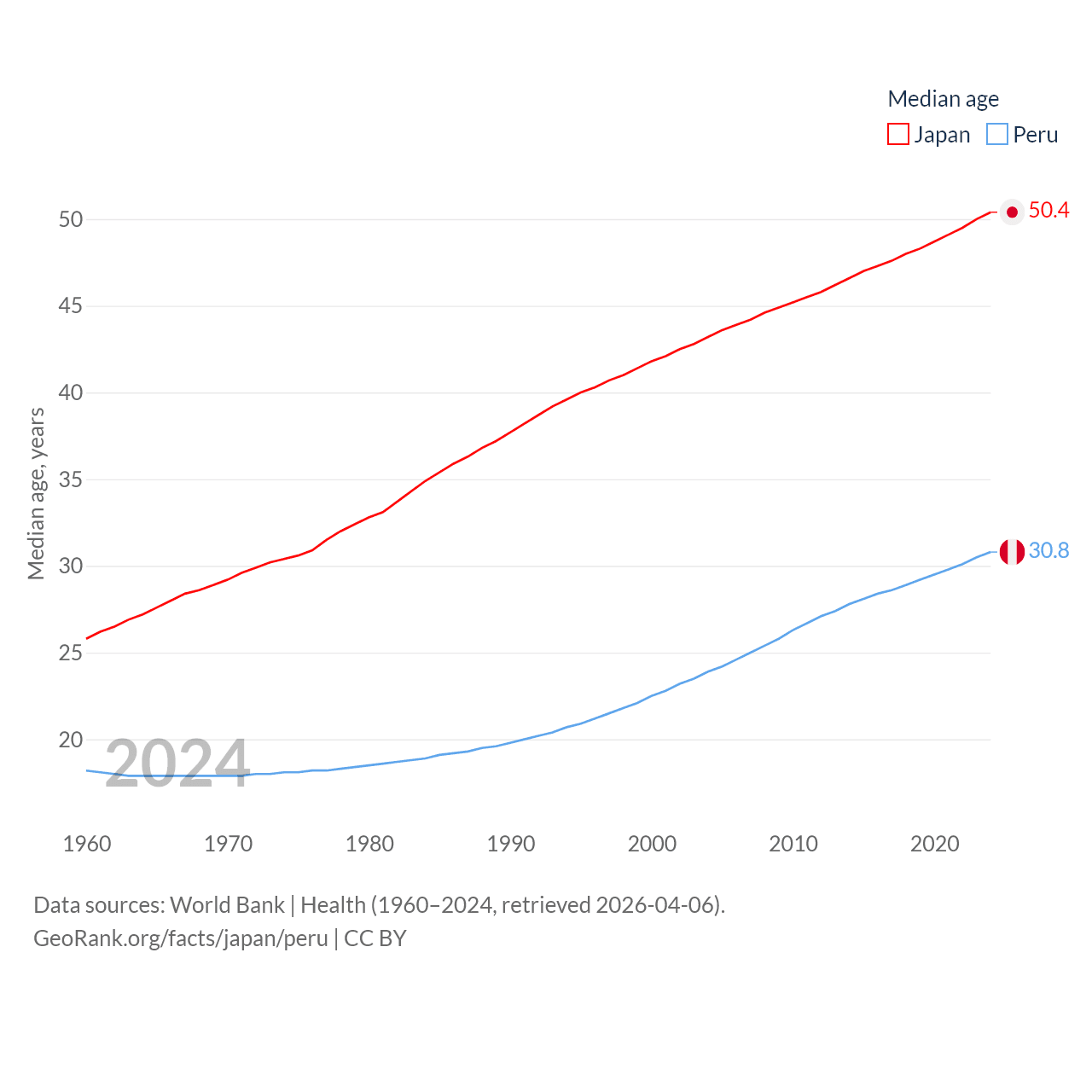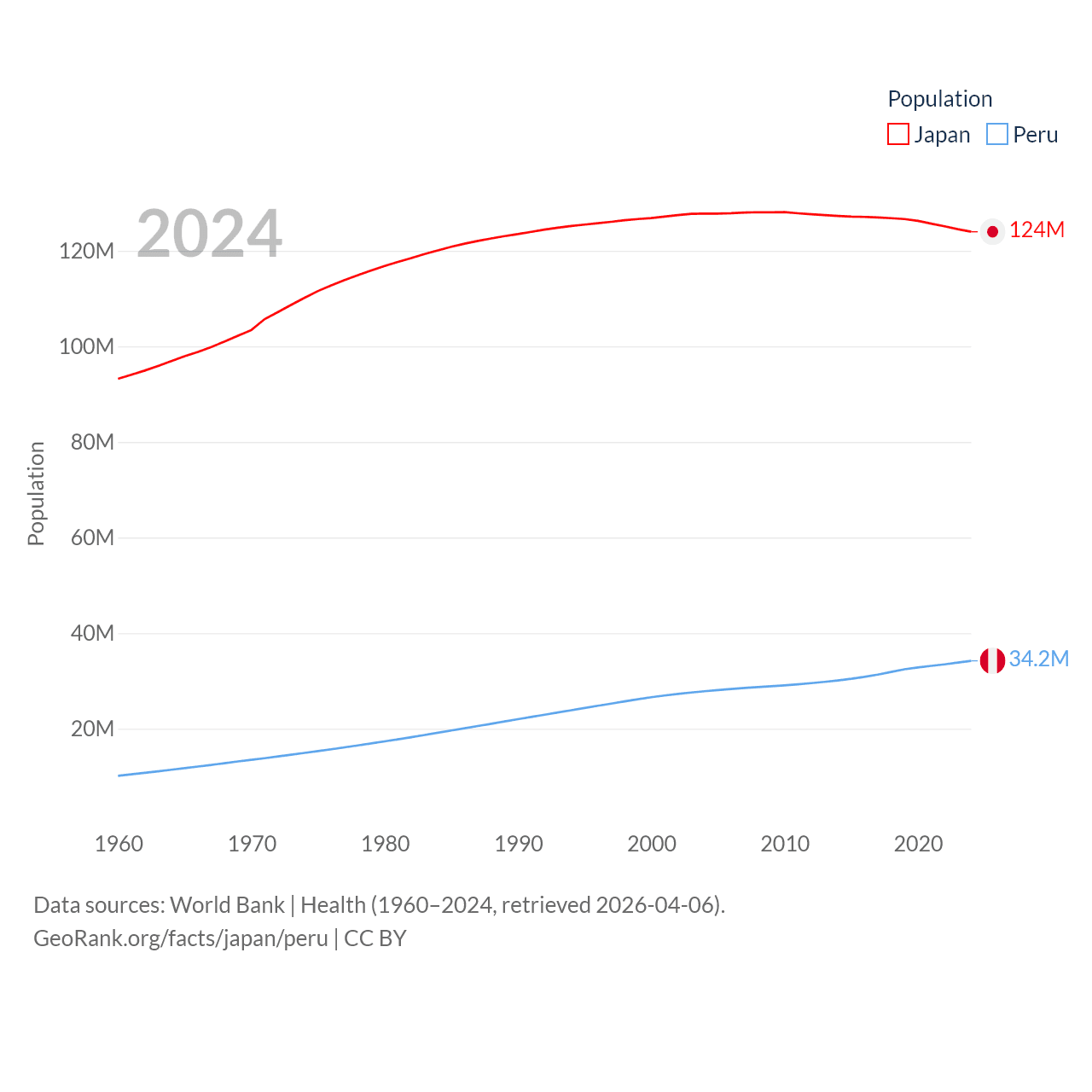 Japan has a population of 124M (ranked 12/197), compared with 34.2M in Peru (ranked 48/197). Japan's land area is 140,761 sq mi versus 494,211 sq mi for Peru (ranked 61st vs. 19th).