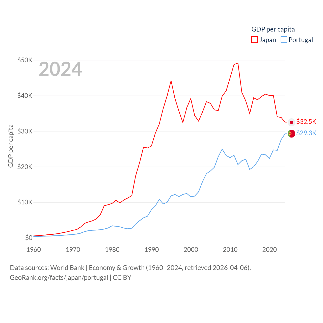 By GDP, Japan ranks 4/197 ($4.03T) and Portugal ranks 46/197 ($313B). By GDP per capita, Japan ranks 38/197 ($32,487), while Portugal ranks 44/197 ($29,292).