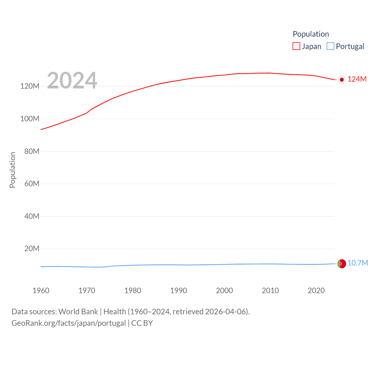 Japan has a population of 124M (ranked 12/197), compared with 10.7M in Portugal (ranked 90/197). Japan's land area is 140,761 sq mi versus 35,369 sq mi for Portugal (ranked 61st vs. 108th).
