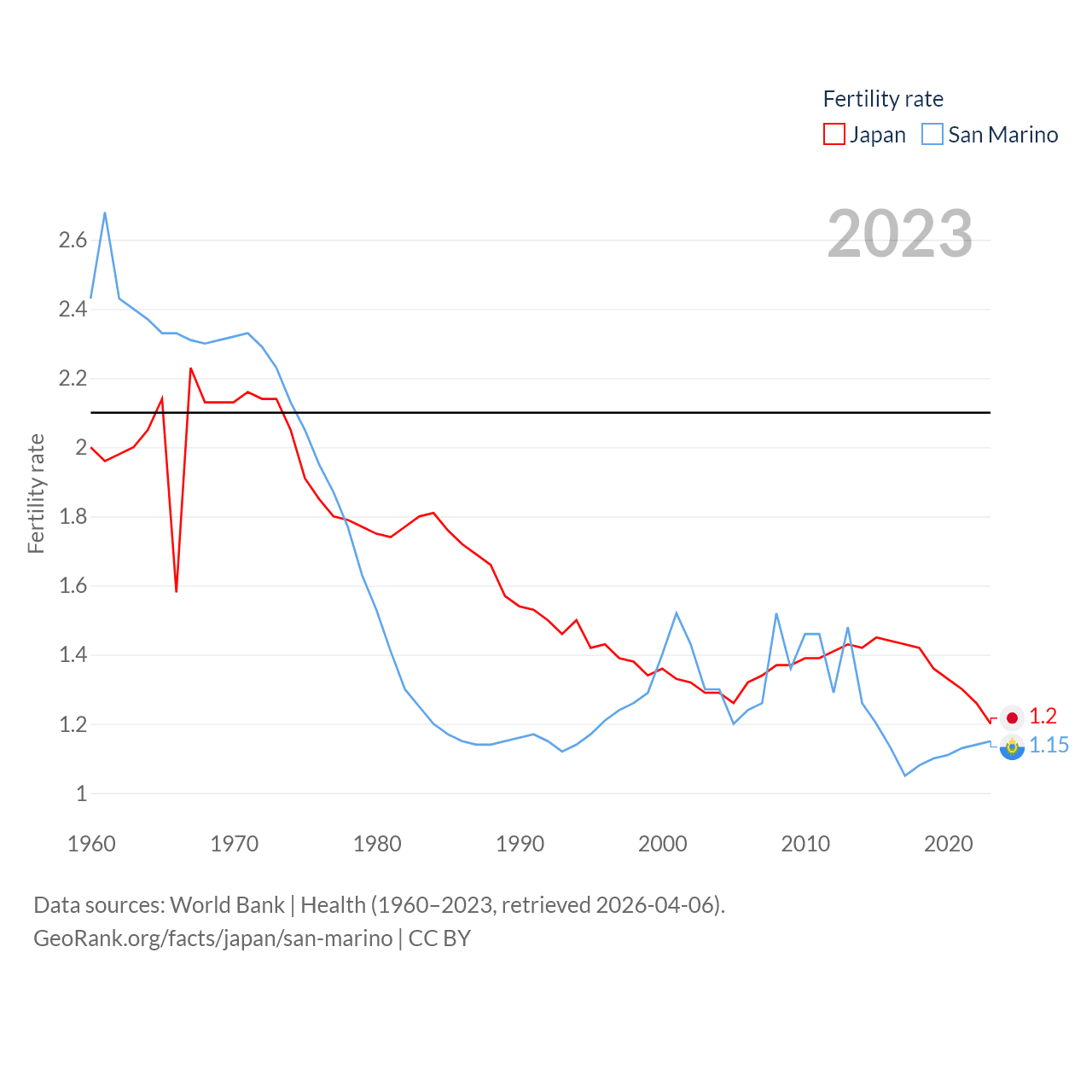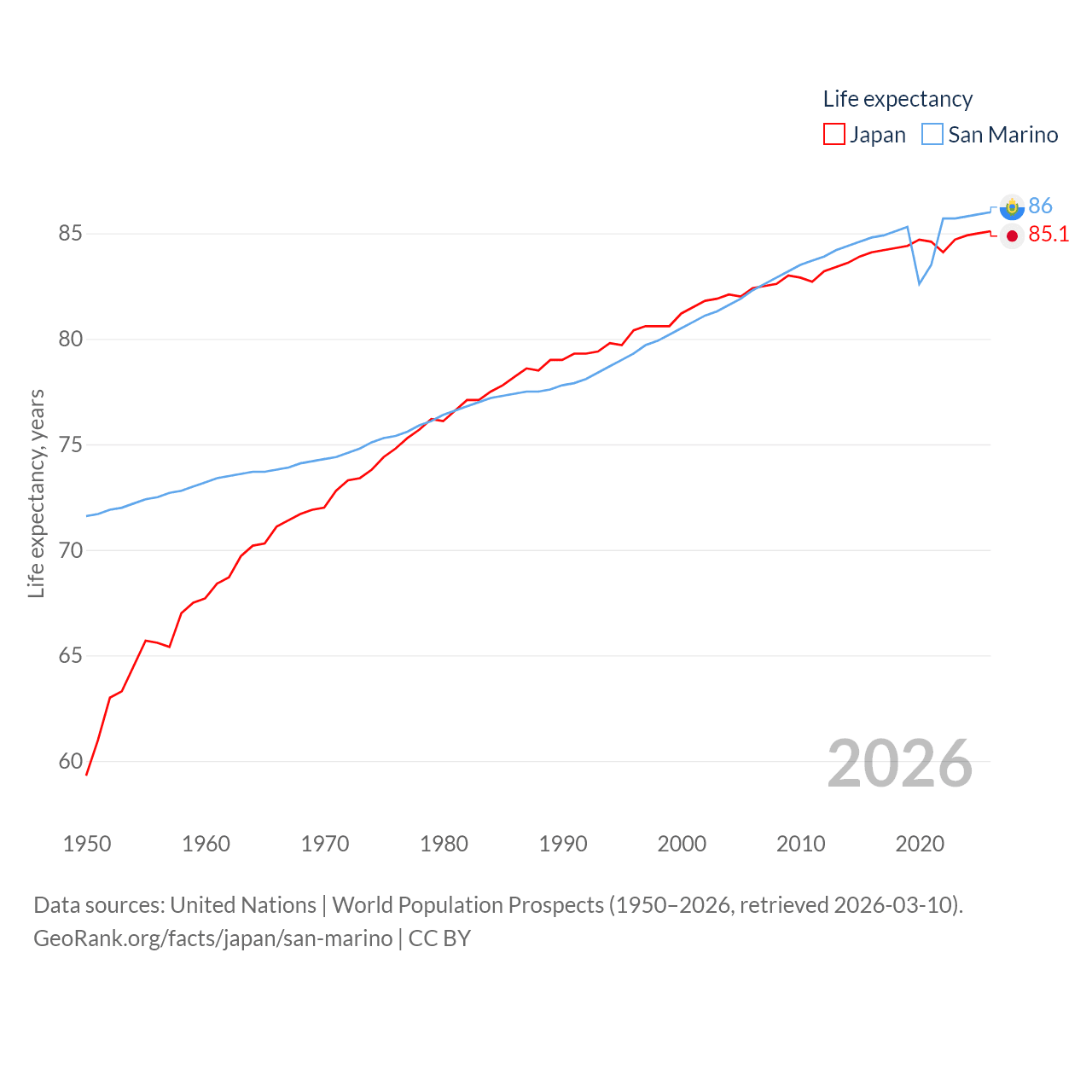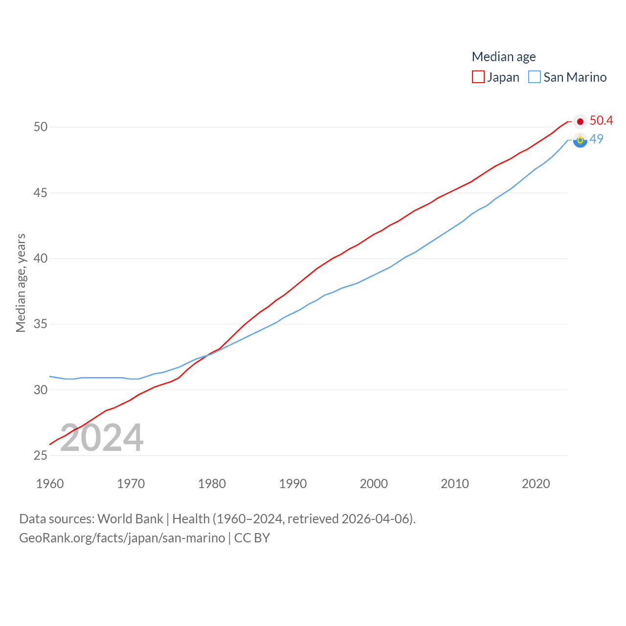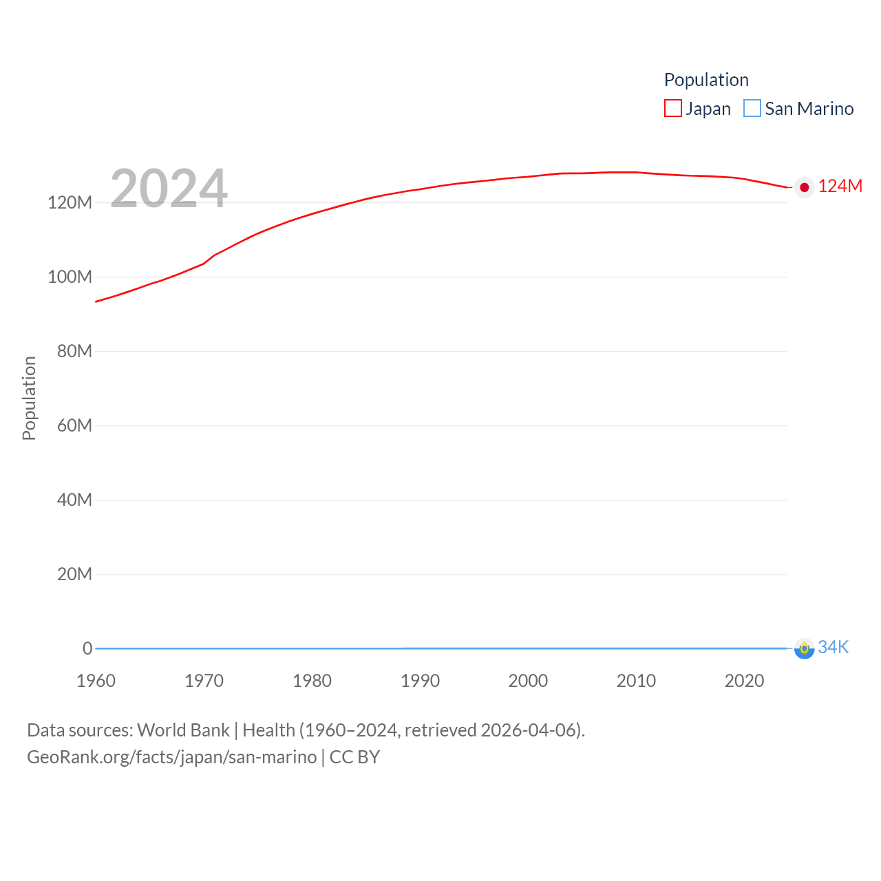 Japan has a population of 124M (ranked 12/197), compared with 34K in San Marino (ranked 193/197). Japan's land area is 140,761 sq mi versus 23.2 sq mi for San Marino (ranked 61st vs. 193rd).