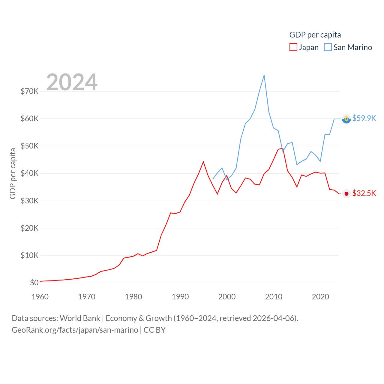 By GDP, Japan ranks 4/197 ($4.03T) and San Marino ranks 180/197 ($2.03B). By GDP per capita, Japan ranks 38/197 ($32,487), while San Marino ranks 15/197 ($59,880).