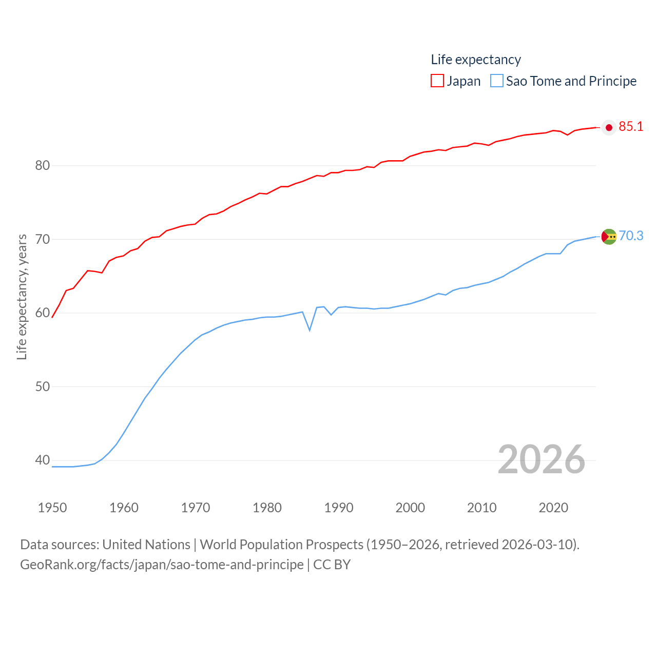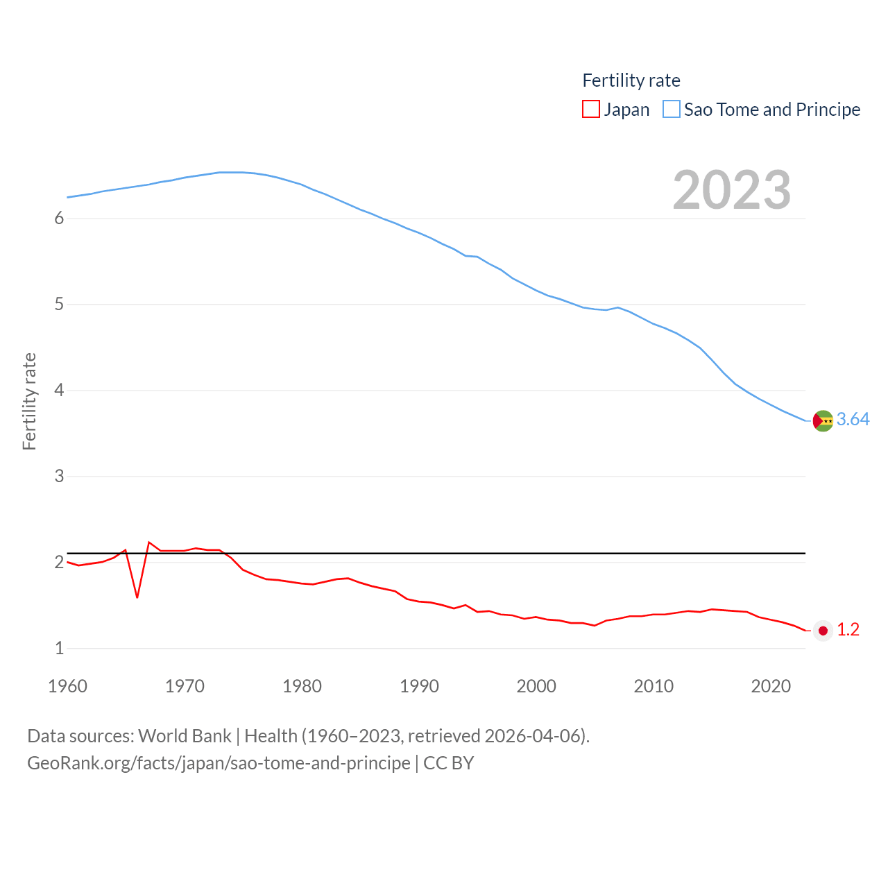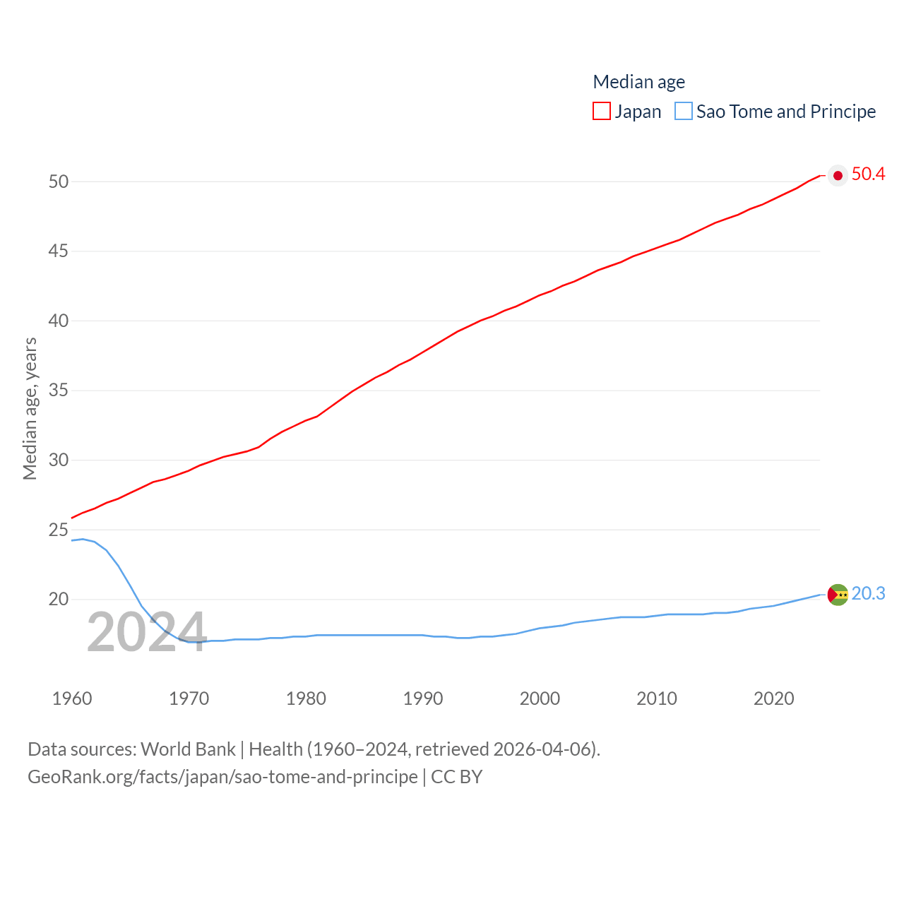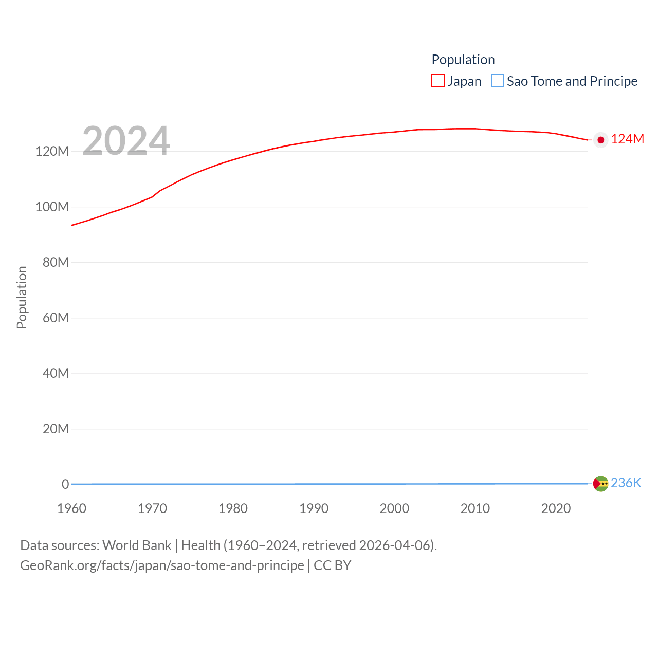 Japan has a population of 124M (ranked 12/197), compared with 236K in Sao Tome and Principe (ranked 176/197). Japan's land area is 140,761 sq mi versus 371 sq mi for Sao Tome and Principe (ranked 61st vs. 172nd).