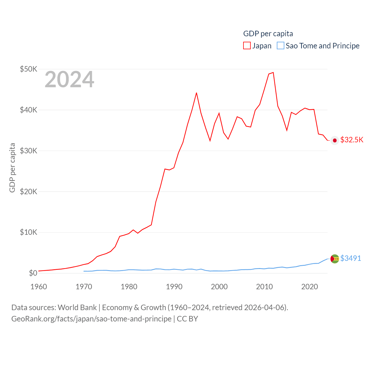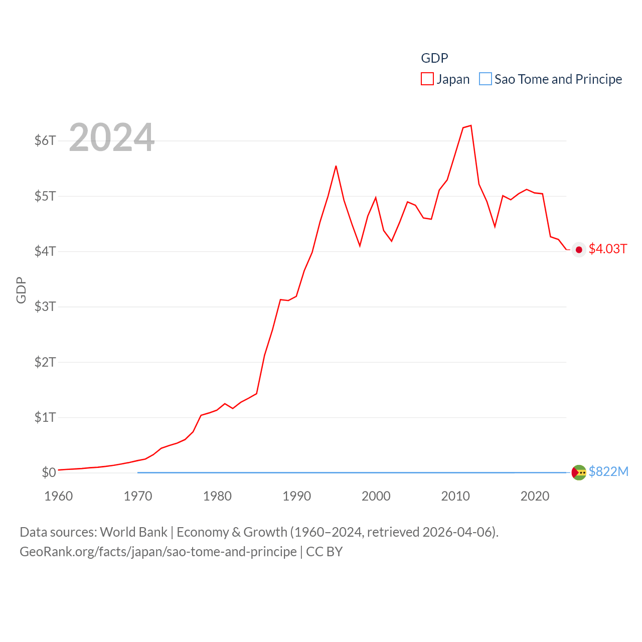 By GDP, Japan ranks 4/197 ($4.03T) and Sao Tome and Principe ranks 189/197 ($822M). By GDP per capita, Japan ranks 38/197 ($32,487), while Sao Tome and Principe ranks 134/197 ($3,491).