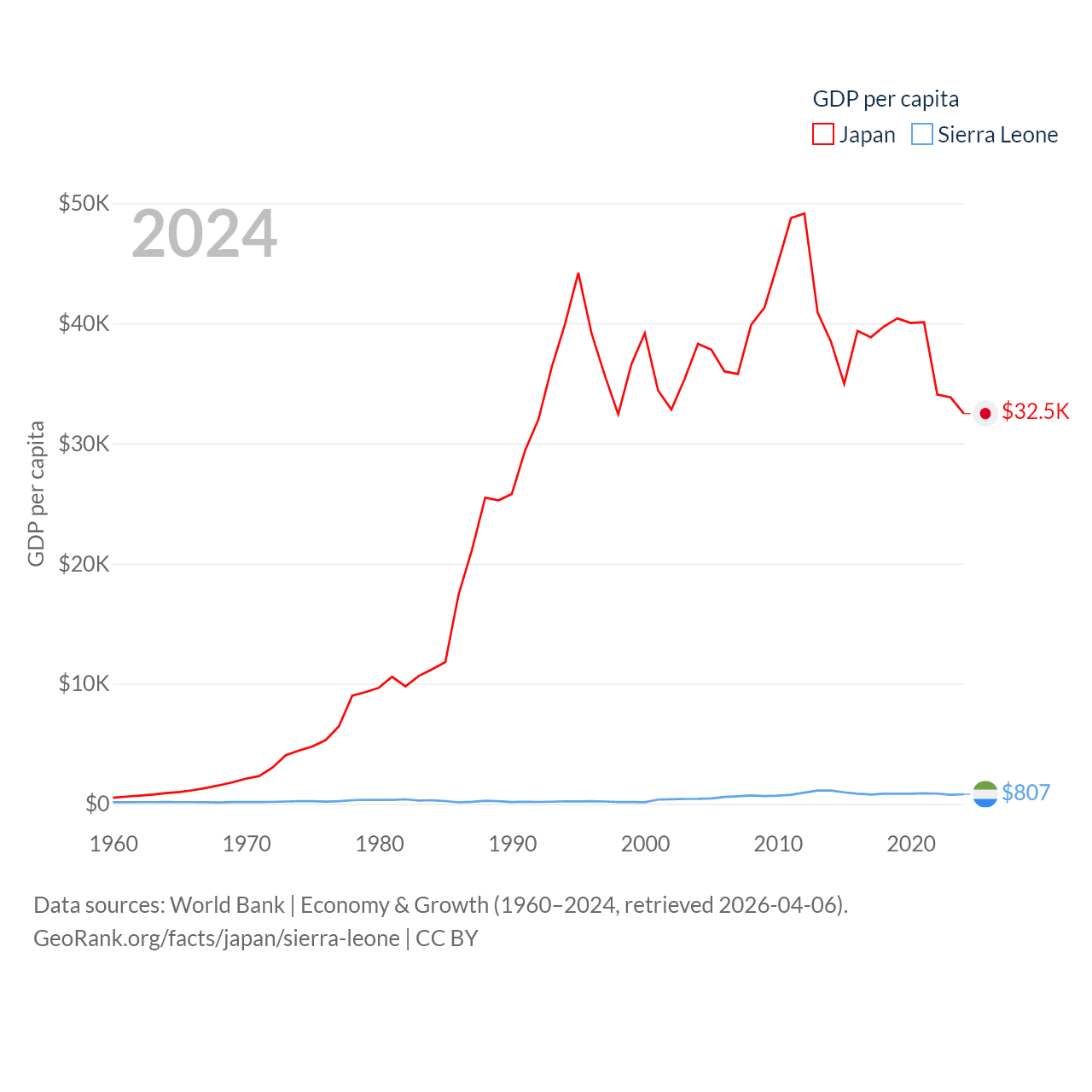 By GDP, Japan ranks 4/197 ($4.03T) and Sierra Leone ranks 160/197 ($6.97B). By GDP per capita, Japan ranks 38/197 ($32,487), while Sierra Leone ranks 186/197 ($807).
