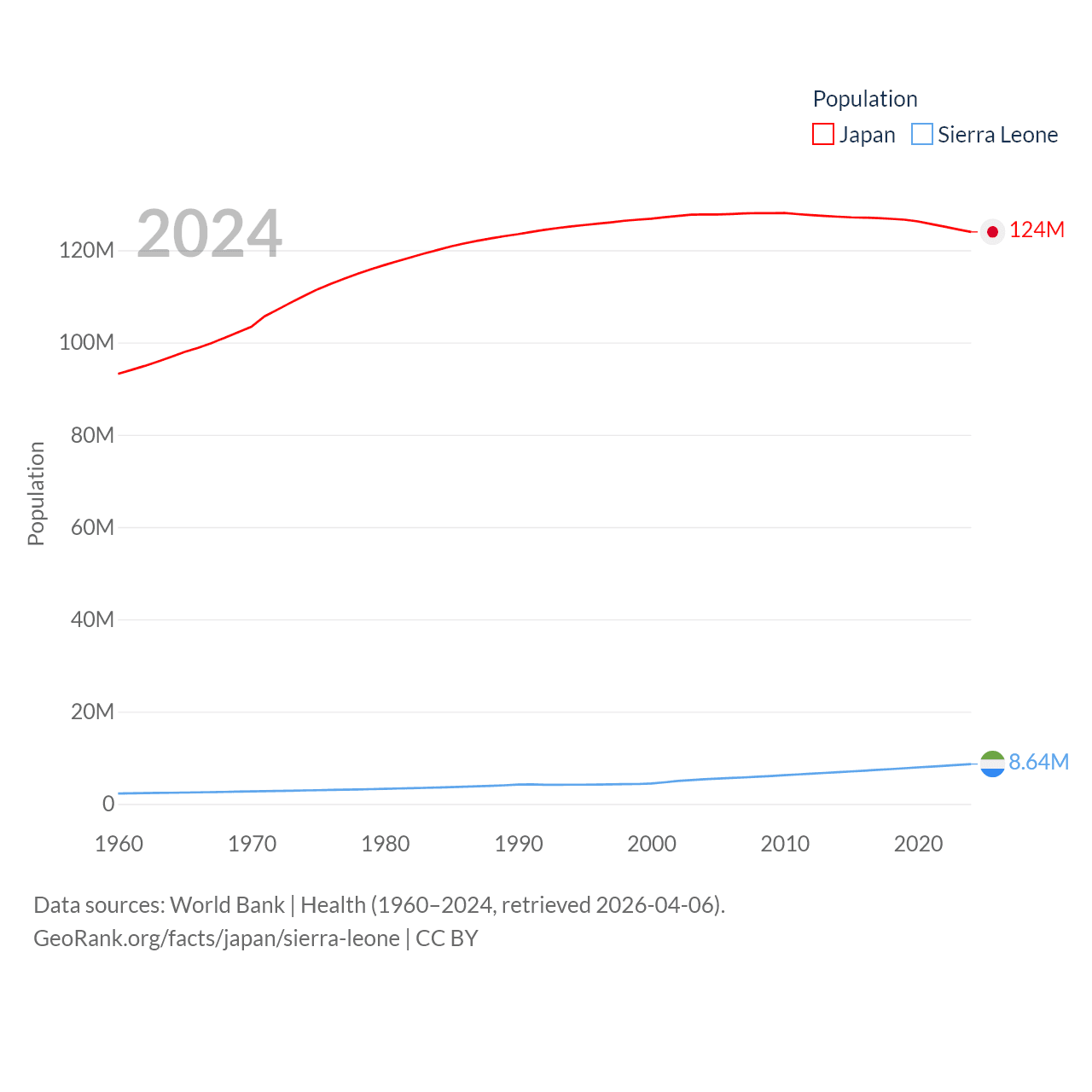Japan has a population of 124M (ranked 12/197), compared with 8.64M in Sierra Leone (ranked 102/197). Japan's land area is 140,761 sq mi versus 27,869 sq mi for Sierra Leone (ranked 61st vs. 116th).