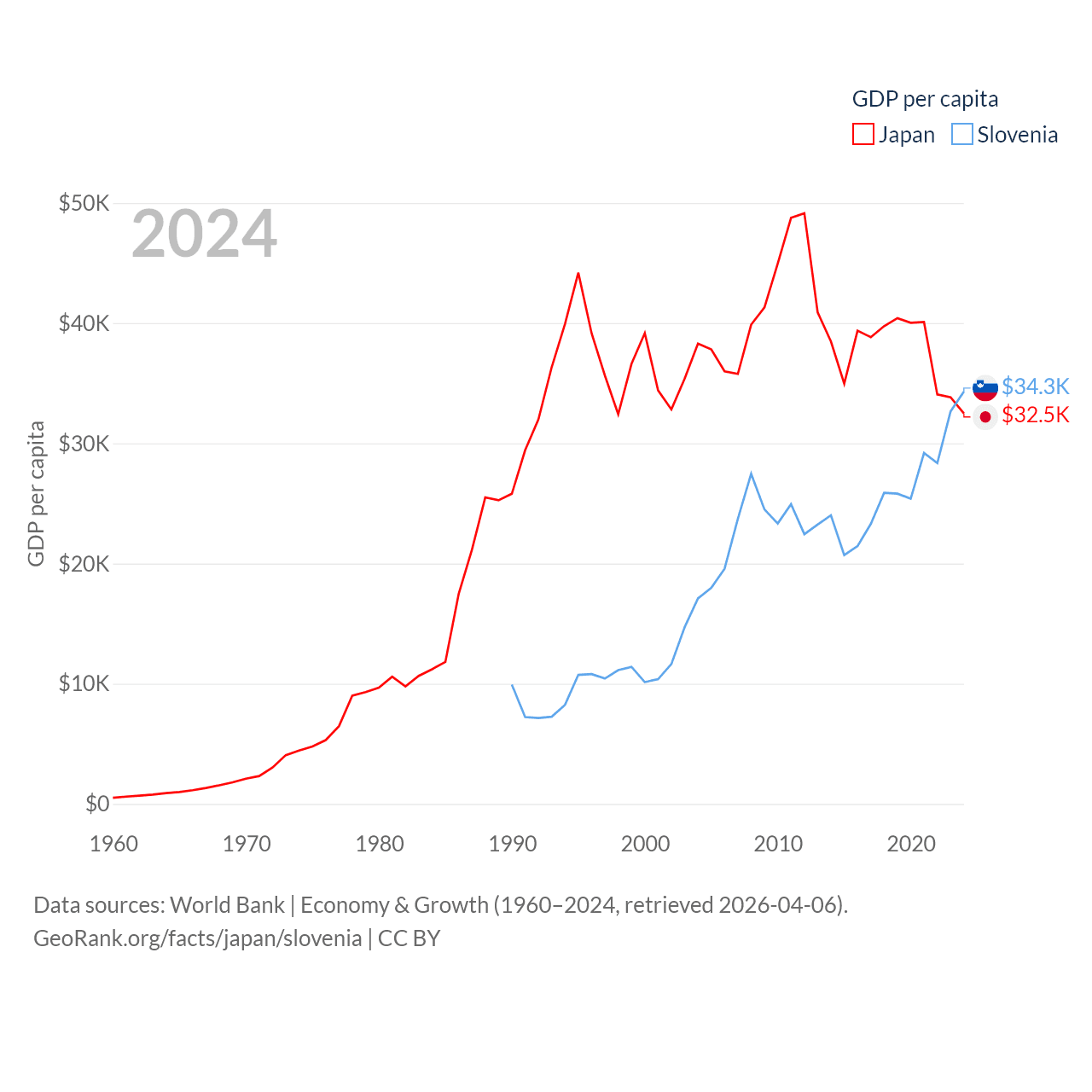 By GDP, Japan ranks 4/197 ($4.03T) and Slovenia ranks 86/197 ($73B). By GDP per capita, Japan ranks 38/197 ($32,487), while Slovenia ranks 34/197 ($34,301).