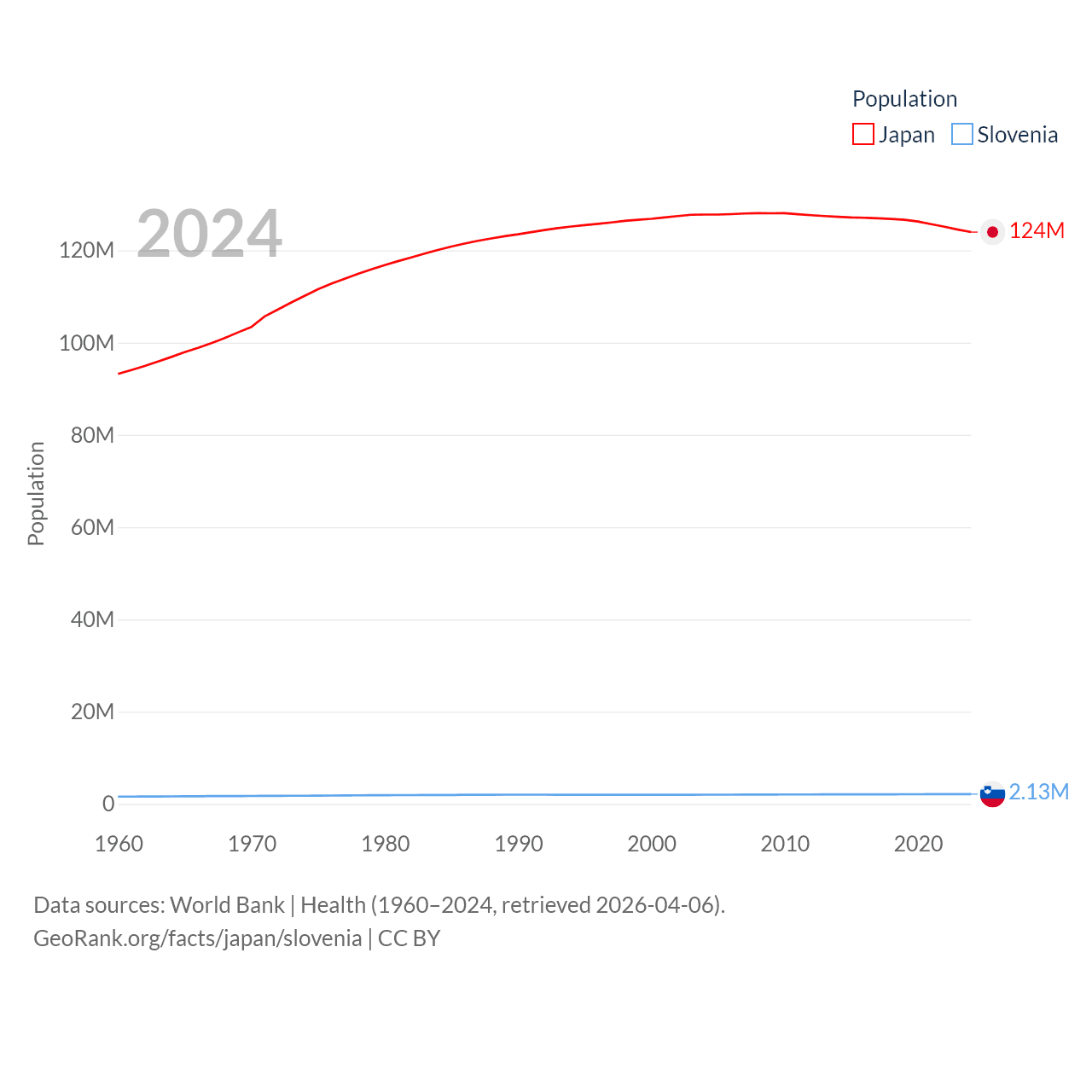 Japan has a population of 124M (ranked 12/197), compared with 2.13M in Slovenia (ranked 147/197). Japan's land area is 140,761 sq mi versus 7,774 sq mi for Slovenia (ranked 61st vs. 151st).