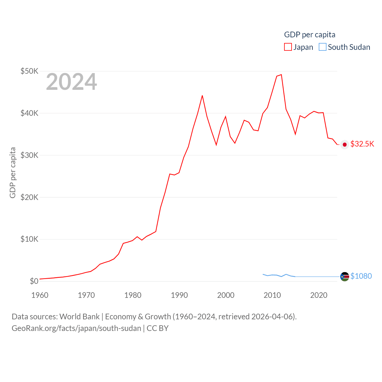 By GDP, Japan ranks 4/197 ($4.03T) and South Sudan ranks 149/197 ($12B). By GDP per capita, Japan ranks 38/197 ($32,487), while South Sudan ranks 175/197 ($1,080).