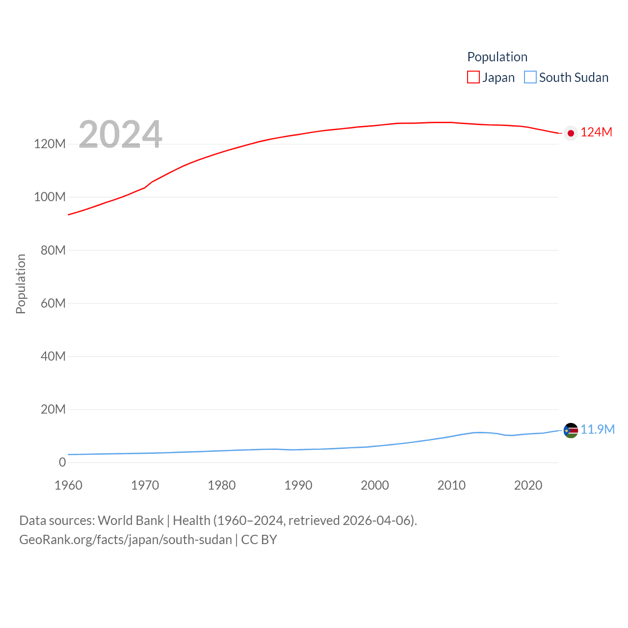 Japan has a population of 124M (ranked 12/197), compared with 11.9M in South Sudan (ranked 81/197). Japan's land area is 140,761 sq mi versus 243,990 sq mi for South Sudan (ranked 61st vs. 41st).