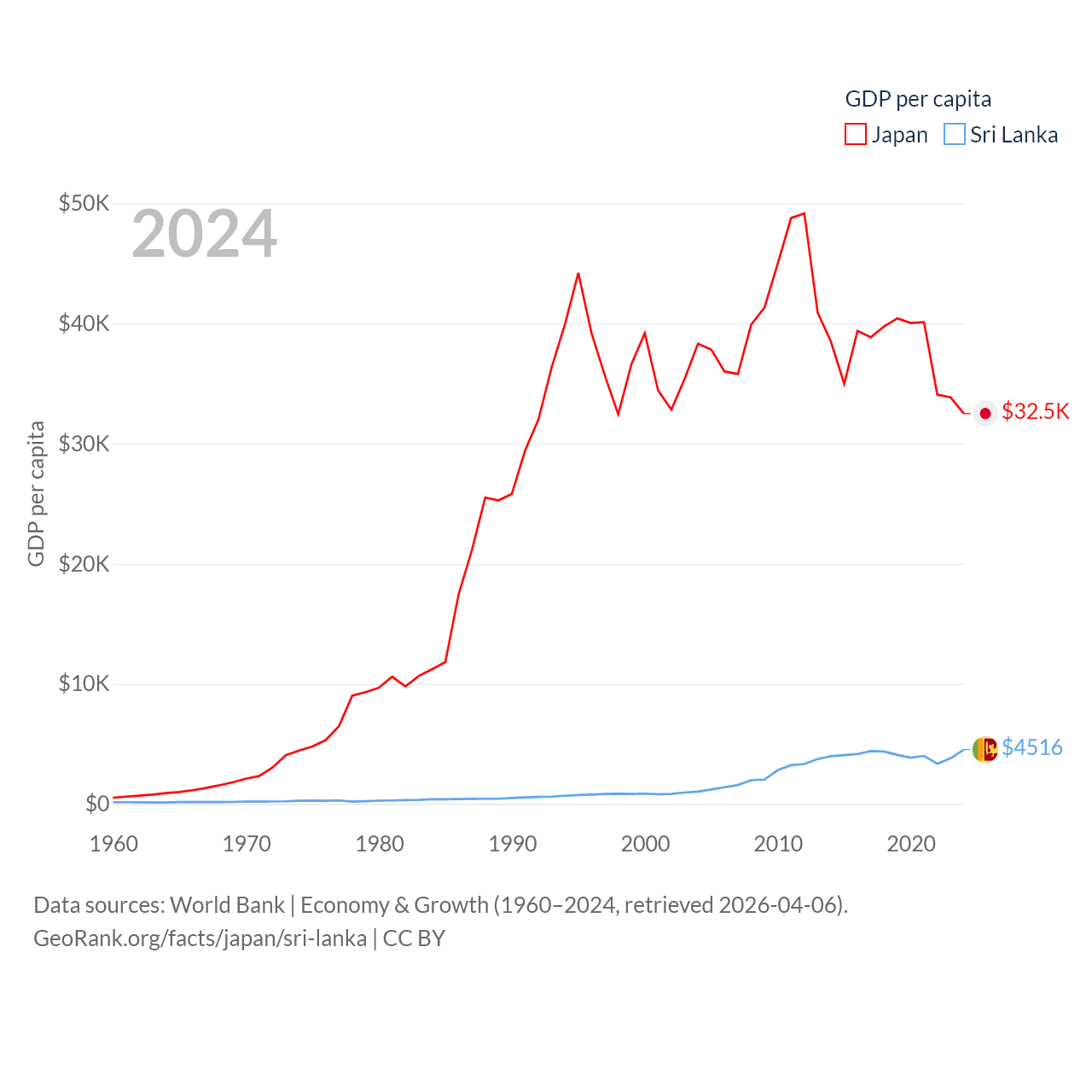 By GDP, Japan ranks 4/197 ($4.03T) and Sri Lanka ranks 72/197 ($99B). By GDP per capita, Japan ranks 38/197 ($32,487), while Sri Lanka ranks 124/197 ($4,516).