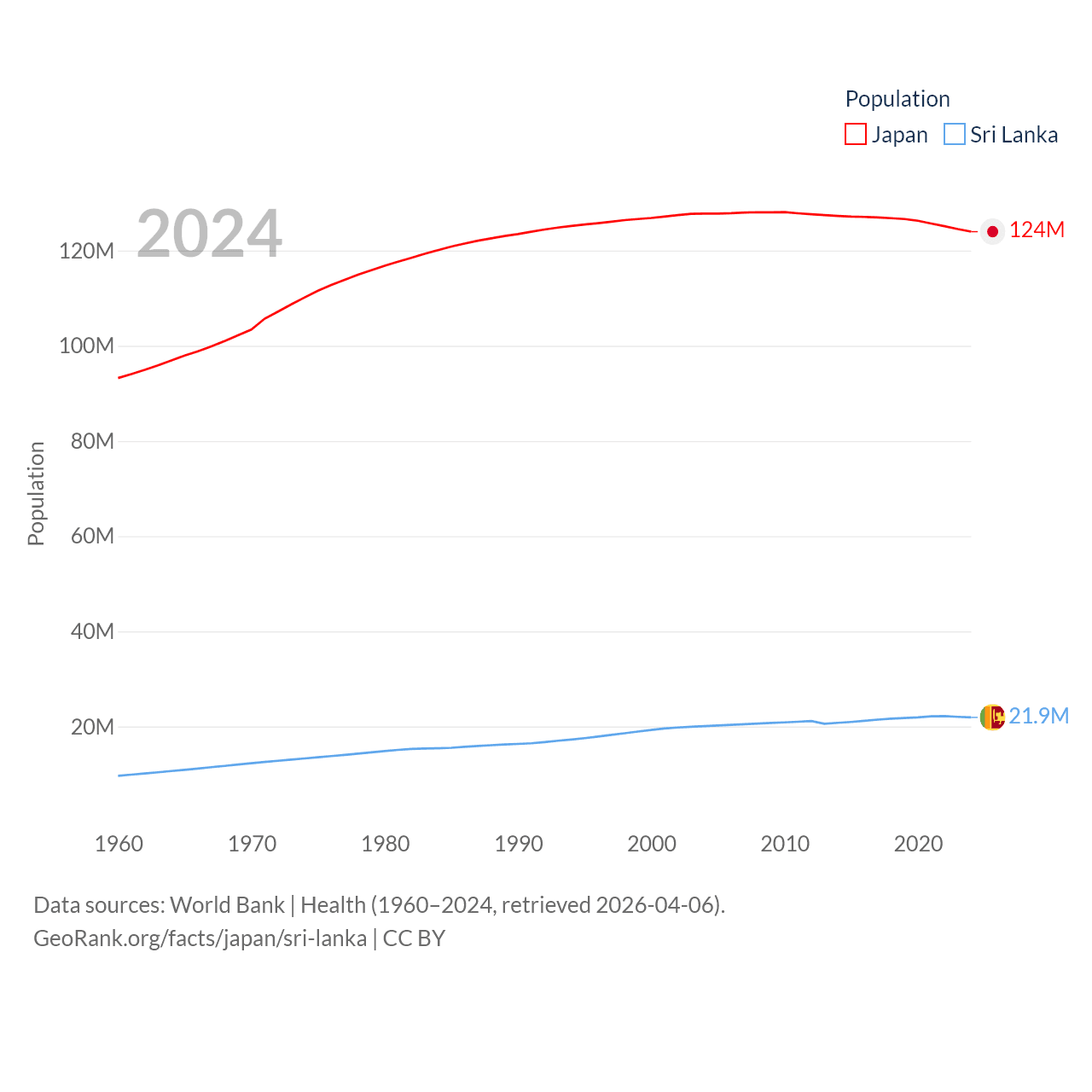 Japan has a population of 124M (ranked 12/197), compared with 21.9M in Sri Lanka (ranked 61/197). Japan's land area is 140,761 sq mi versus 23,884 sq mi for Sri Lanka (ranked 61st vs. 122nd).