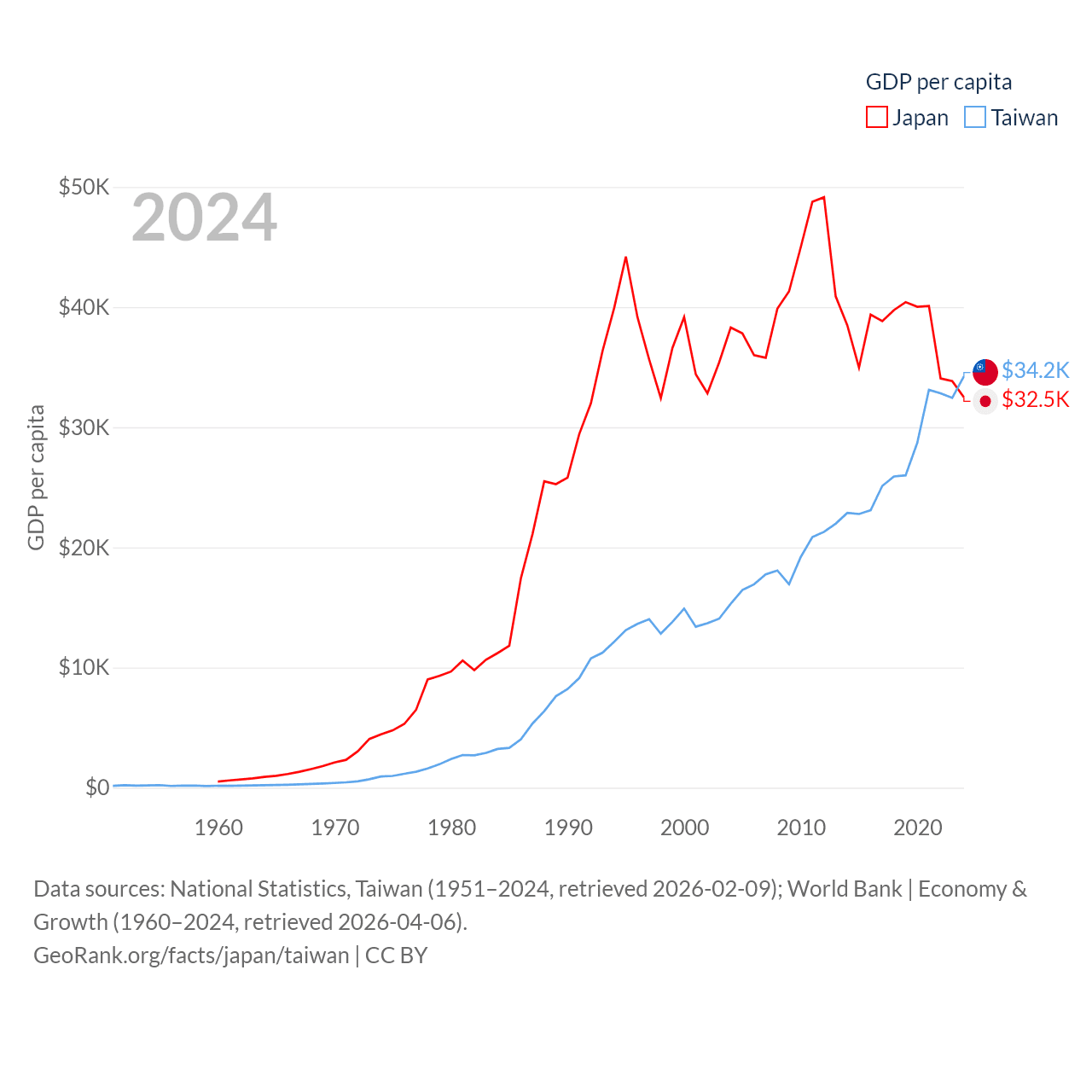 By GDP, Japan ranks 4/197 ($4.03T) and Taiwan ranks 22/197 ($802B). By GDP per capita, Japan ranks 38/197 ($32,487), while Taiwan ranks 35/197 ($34,238).