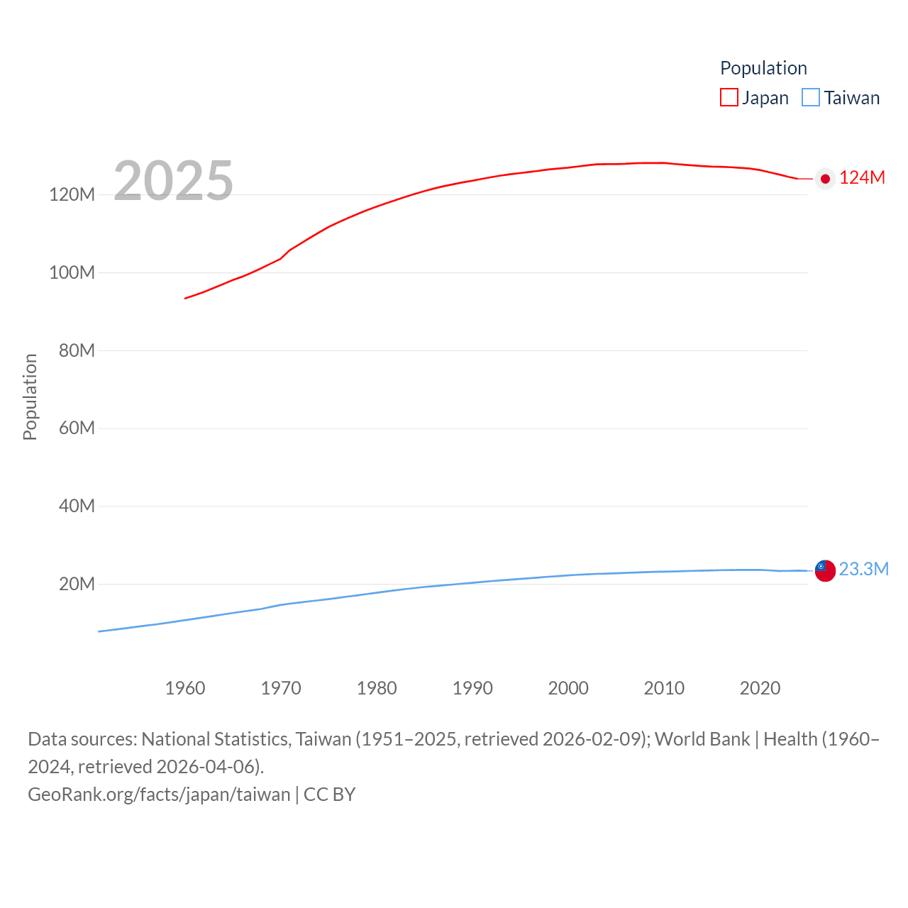 Japan has a population of 124M (ranked 12/197), compared with 23.3M in Taiwan (ranked 60/197). Japan's land area is 140,761 sq mi versus 13,976 sq mi for Taiwan (ranked 61st vs. 133rd).