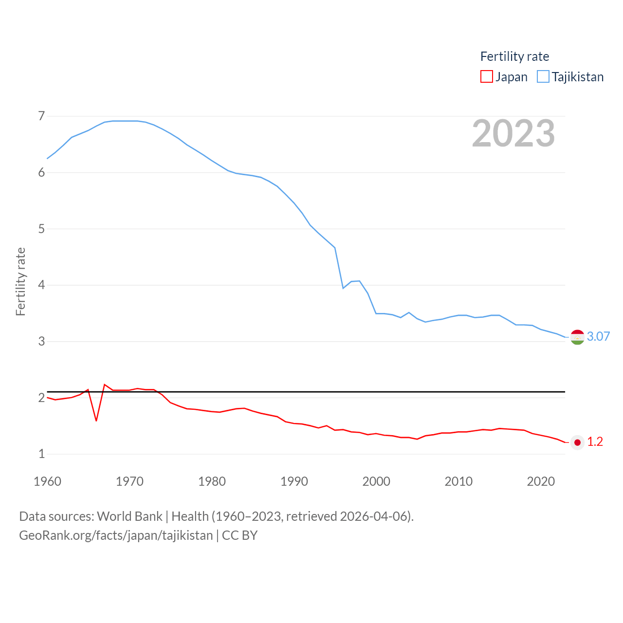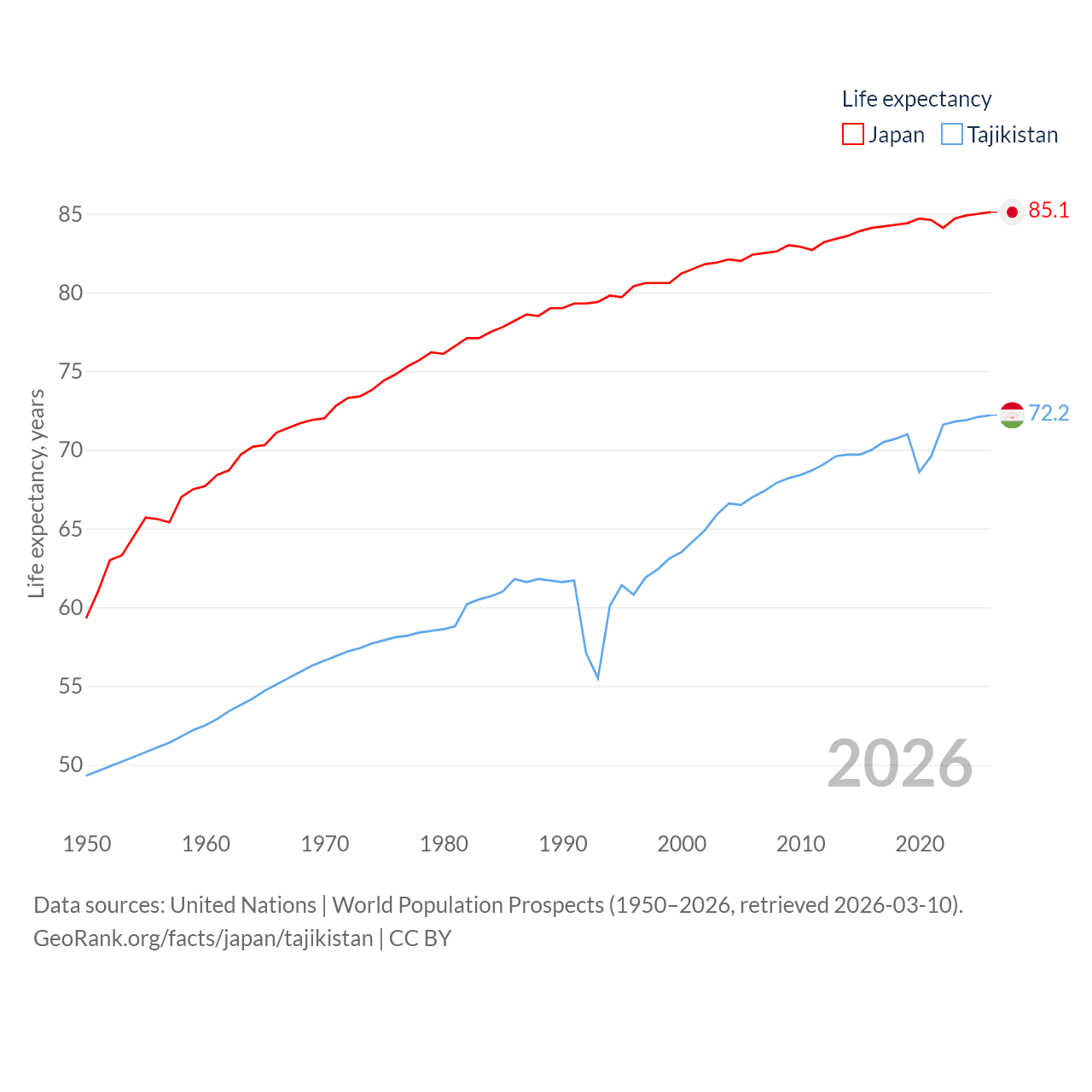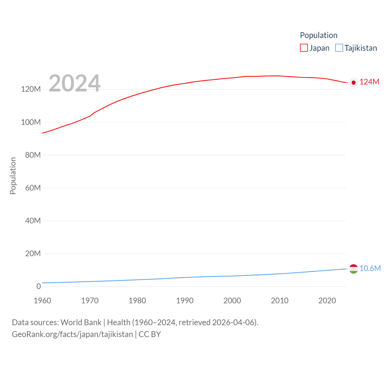Japan has a population of 124M (ranked 12/197), compared with 10.6M in Tajikistan (ranked 91/197). Japan's land area is 140,761 sq mi versus 53,587 sq mi for Tajikistan (ranked 61st vs. 93rd).