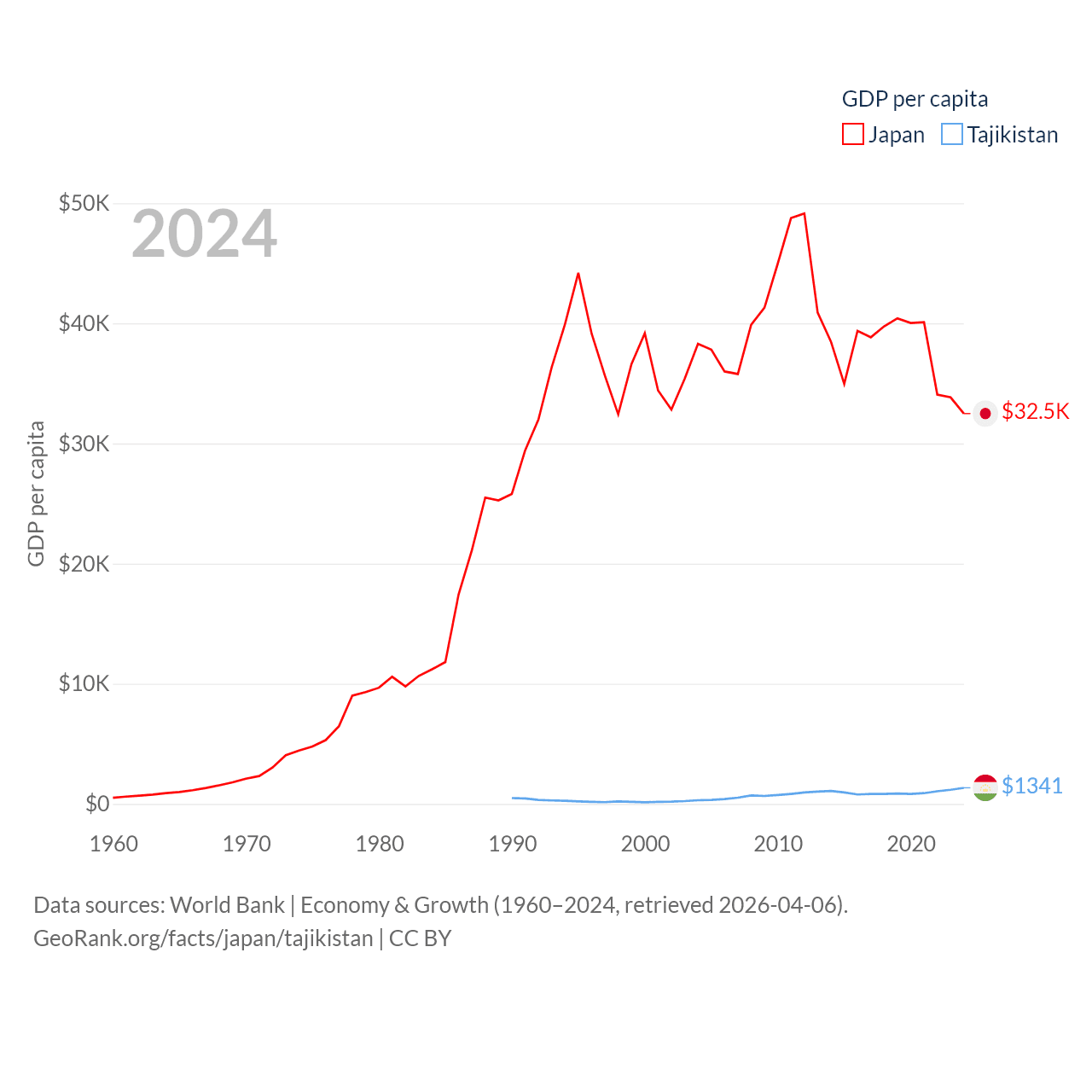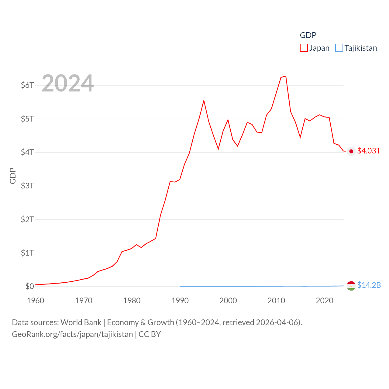 By GDP, Japan ranks 4/197 ($4.03T) and Tajikistan ranks 145/197 ($14.2B). By GDP per capita, Japan ranks 38/197 ($32,487), while Tajikistan ranks 166/197 ($1,341).
