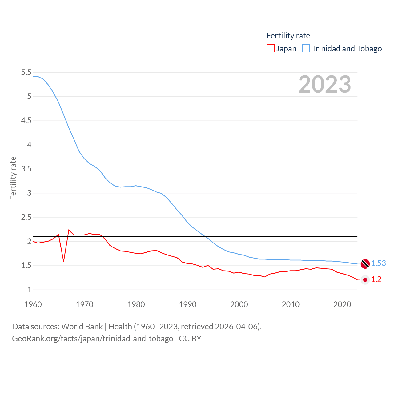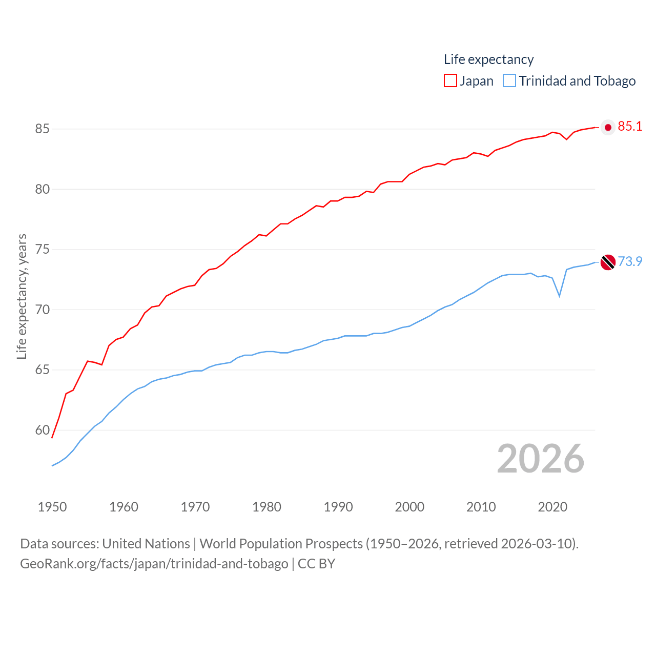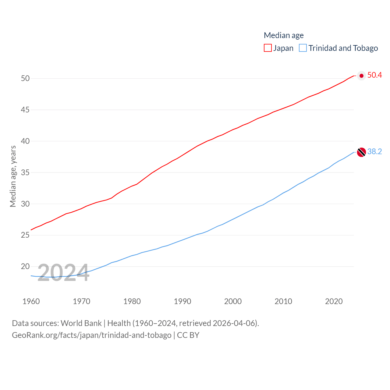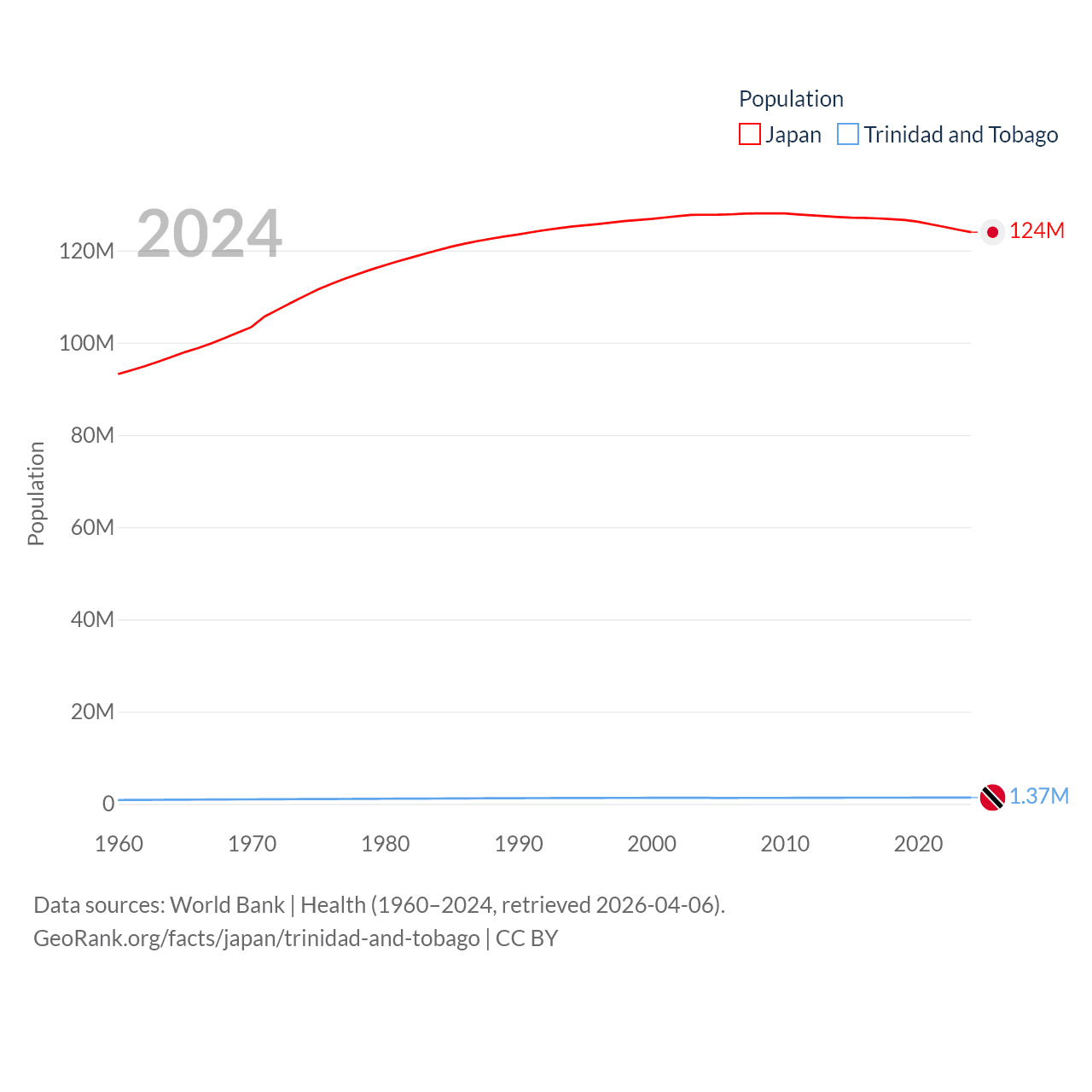 Japan has a population of 124M (ranked 12/197), compared with 1.37M in Trinidad and Tobago (ranked 154/197). Japan's land area is 140,761 sq mi versus 1,981 sq mi for Trinidad and Tobago (ranked 61st vs. 166th).