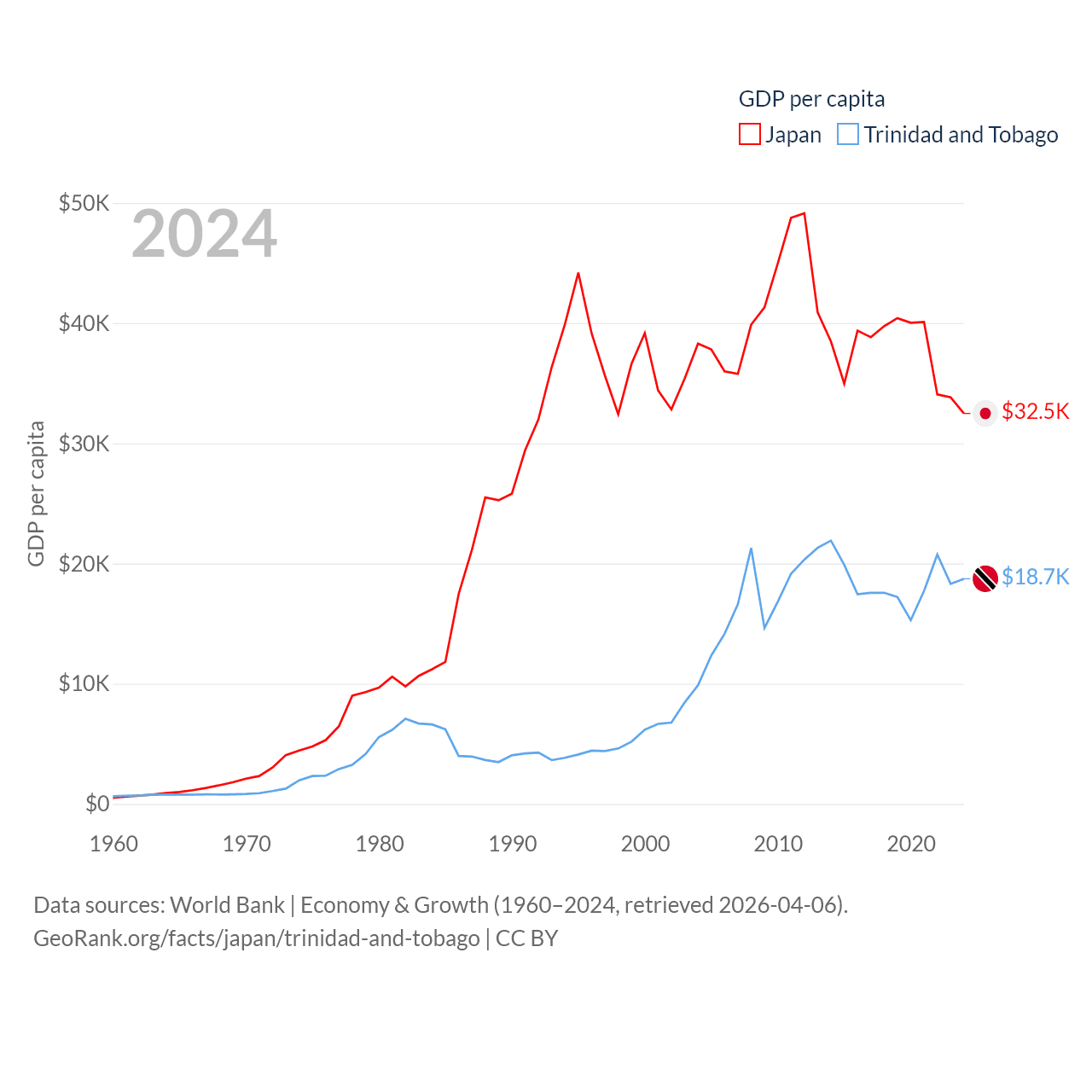 By GDP, Japan ranks 4/197 ($4.03T) and Trinidad and Tobago ranks 115/197 ($25.6B). By GDP per capita, Japan ranks 38/197 ($32,487), while Trinidad and Tobago ranks 61/197 ($18,733).