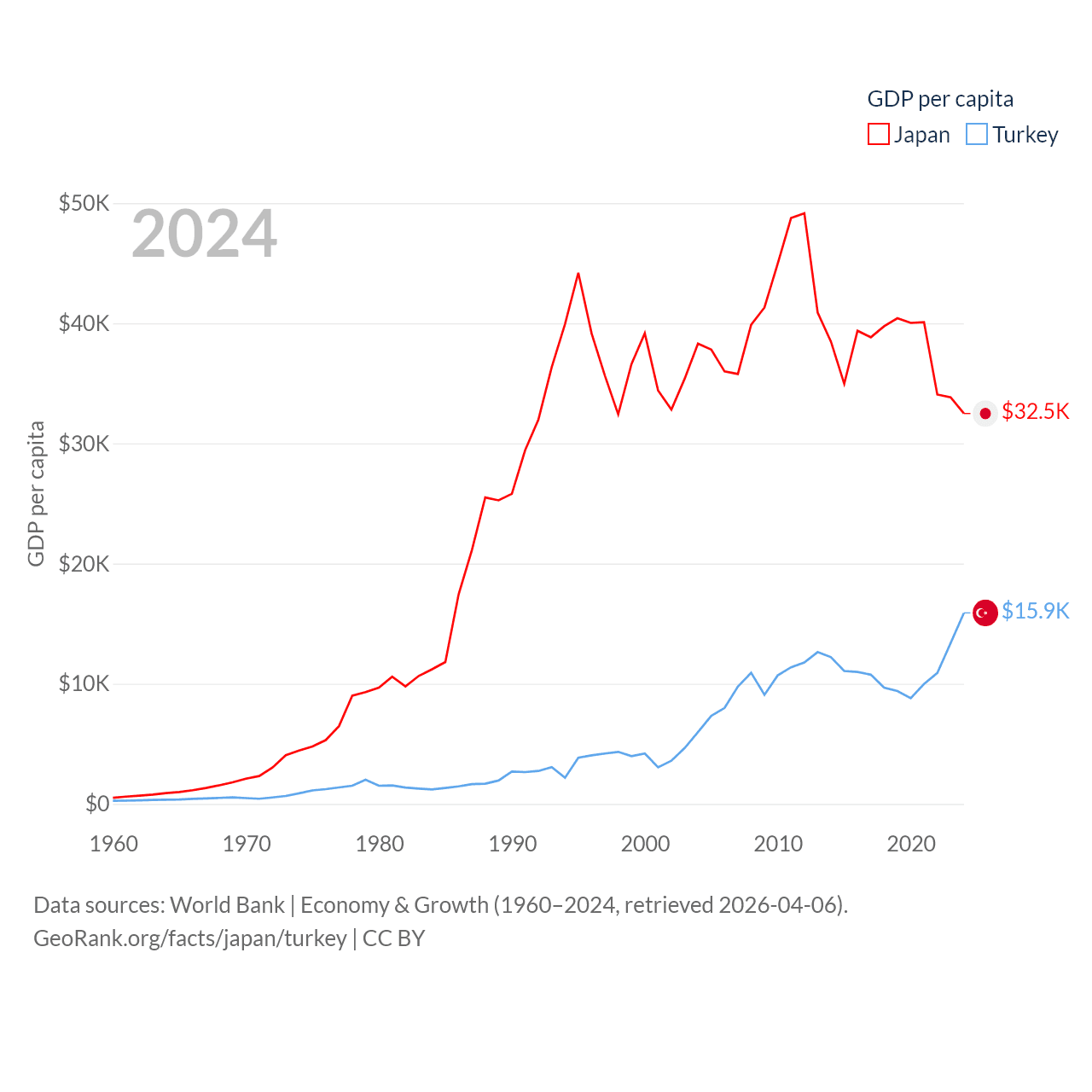 By GDP, Japan ranks 4/197 ($4.03T) and Turkey ranks 17/197 ($1.36T). By GDP per capita, Japan ranks 38/197 ($32,487), while Turkey ranks 66/197 ($15,893).