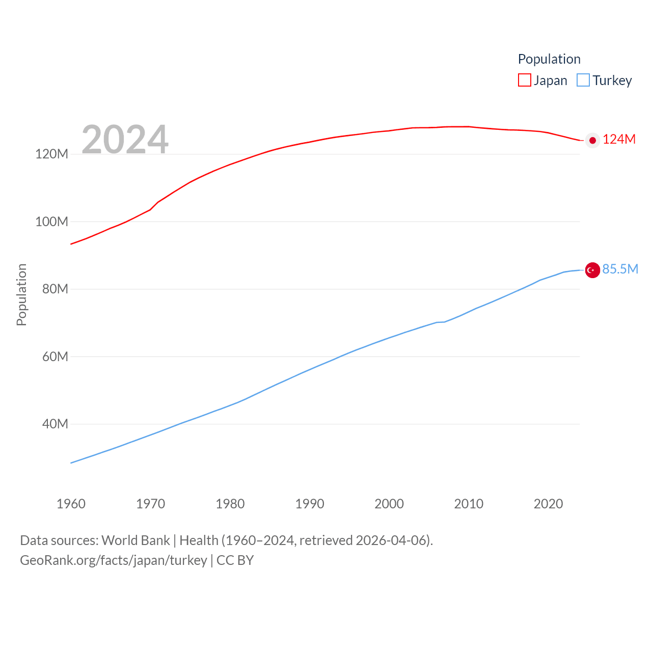 Japan has a population of 124M (ranked 12/197), compared with 85.5M in Turkey (ranked 18/197). Japan's land area is 140,761 sq mi versus 297,156 sq mi for Turkey (ranked 61st vs. 36th).