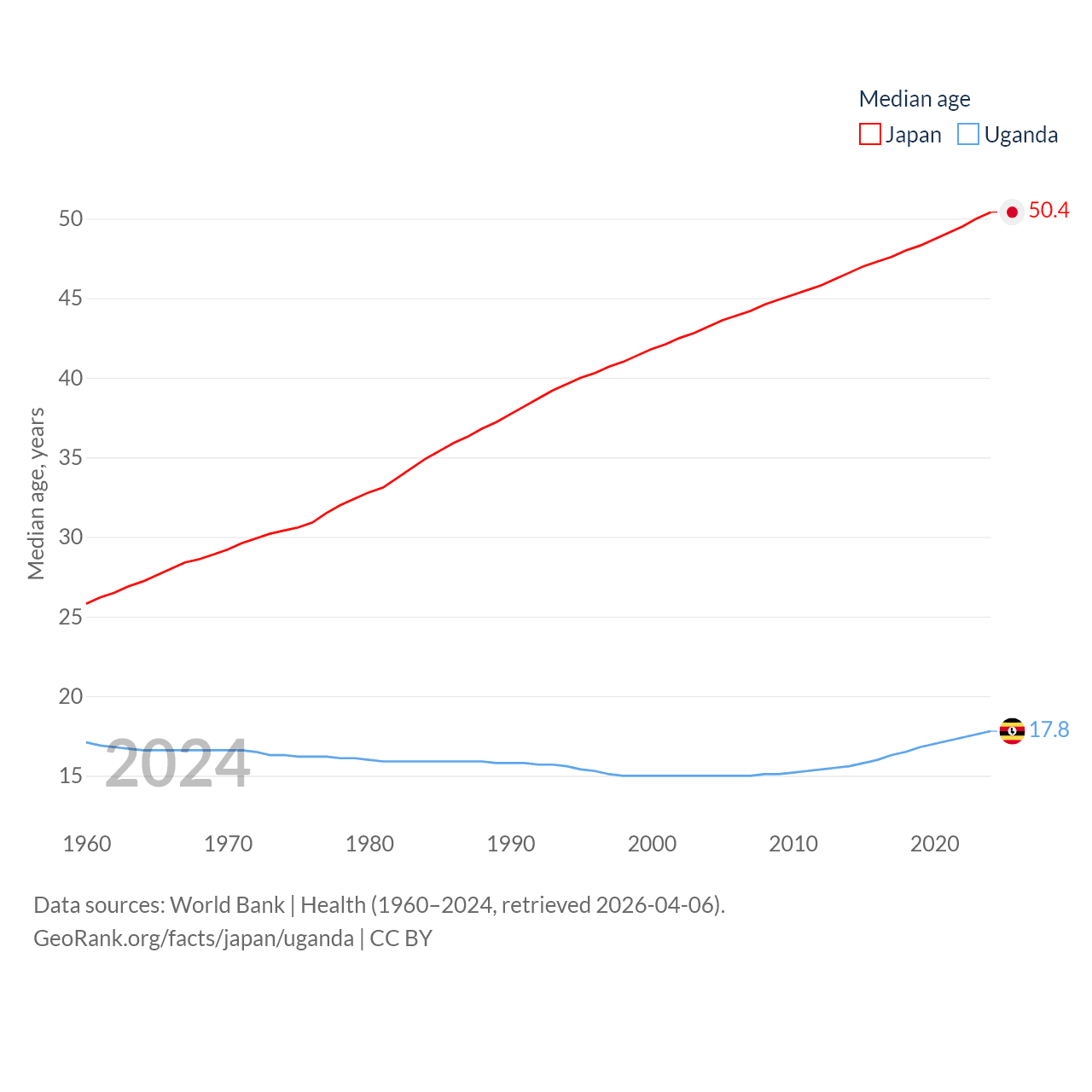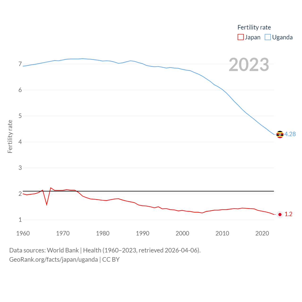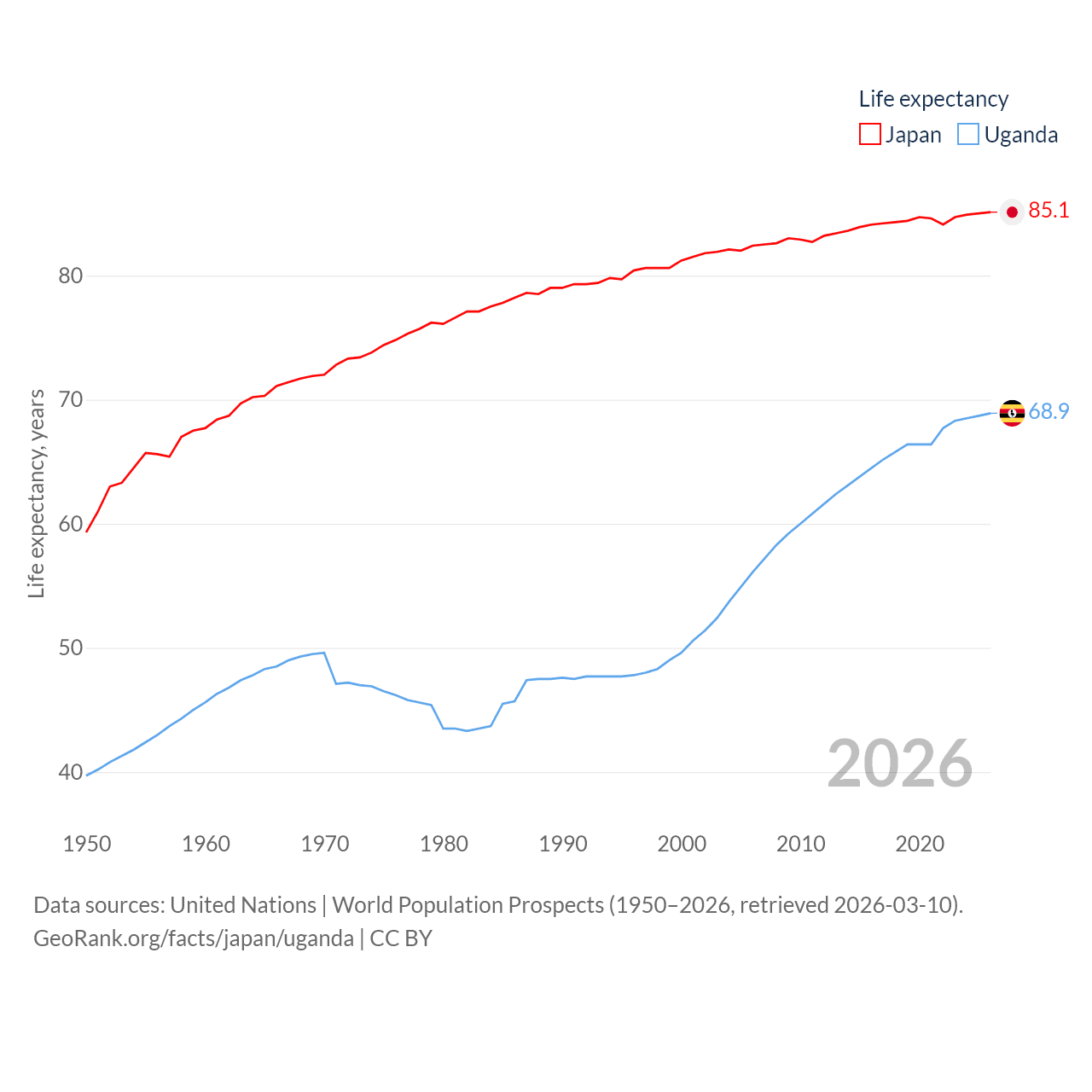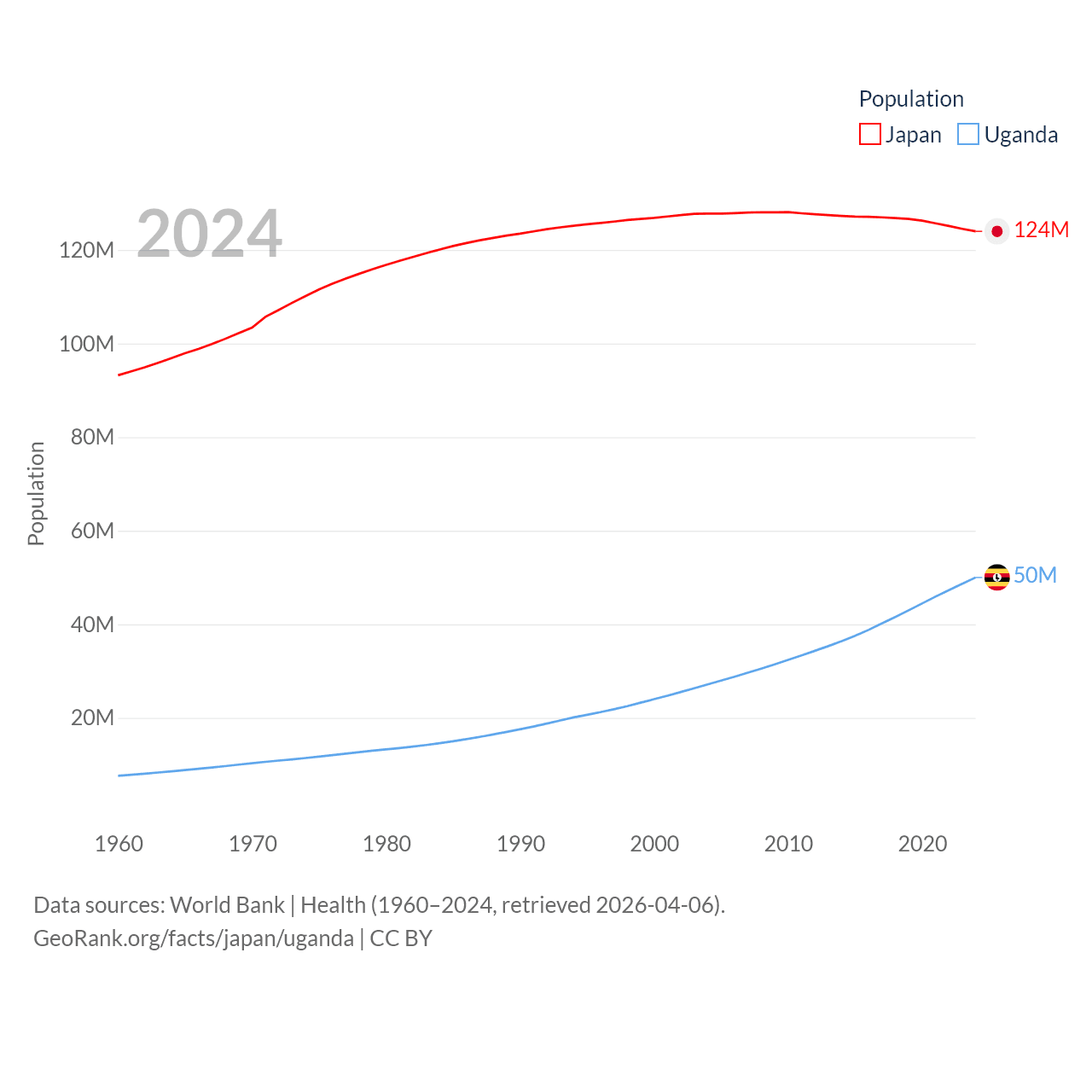 Japan has a population of 124M (ranked 12/197), compared with 50M in Uganda (ranked 31/197). Japan's land area is 140,761 sq mi versus 77,421 sq mi for Uganda (ranked 61st vs. 84th).