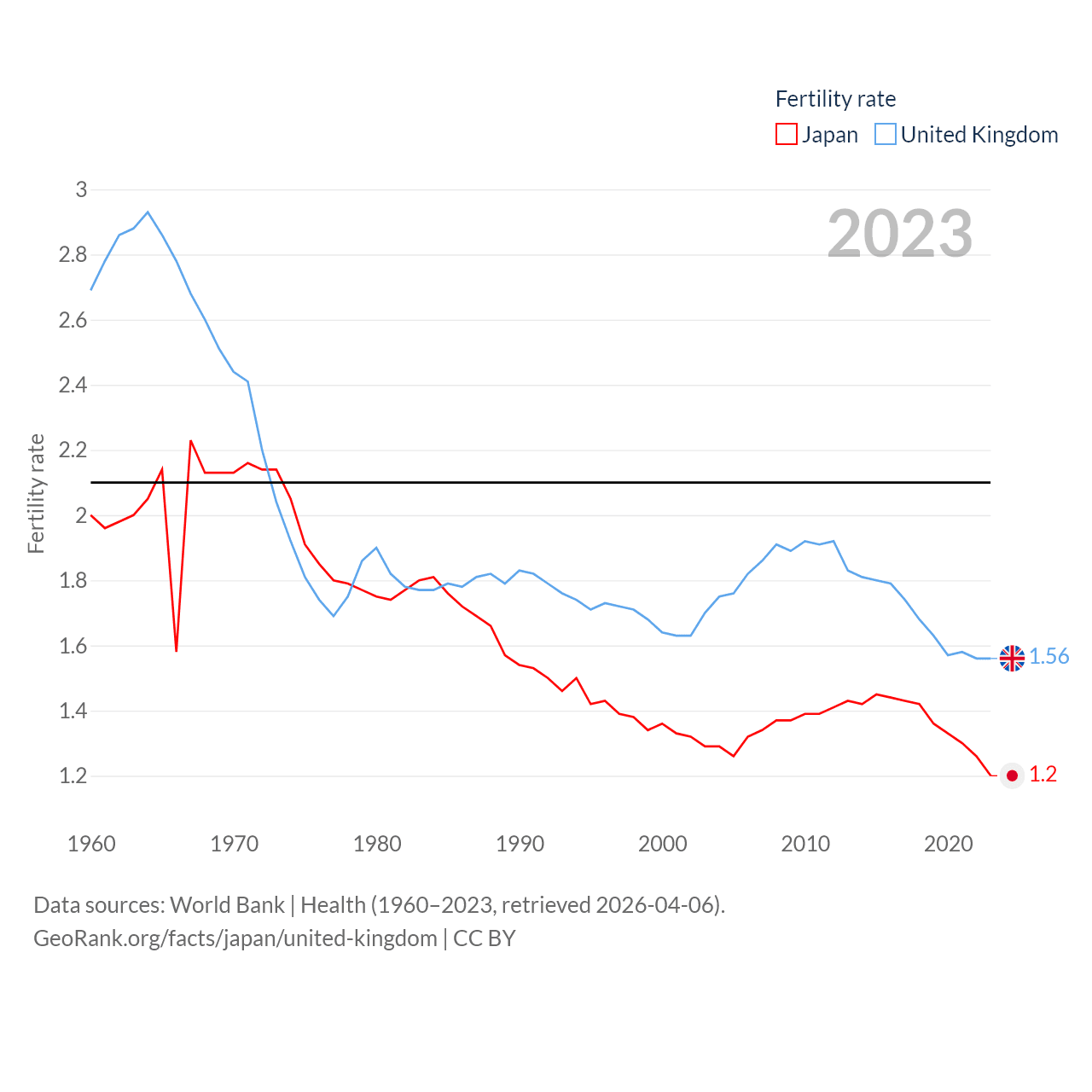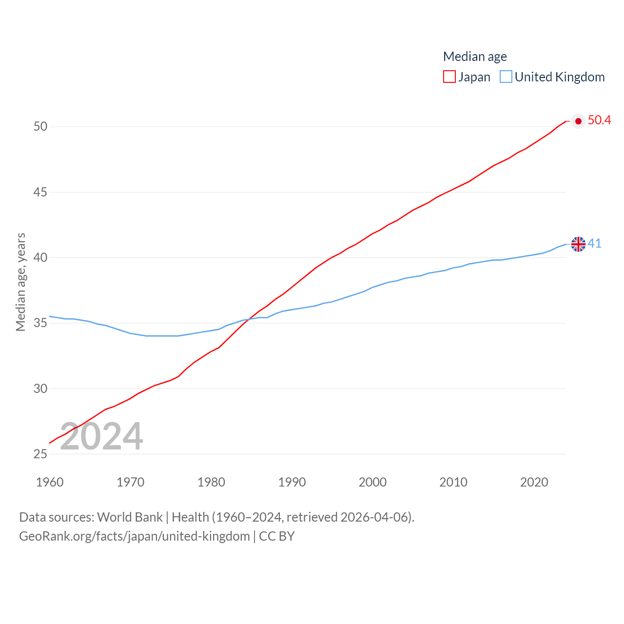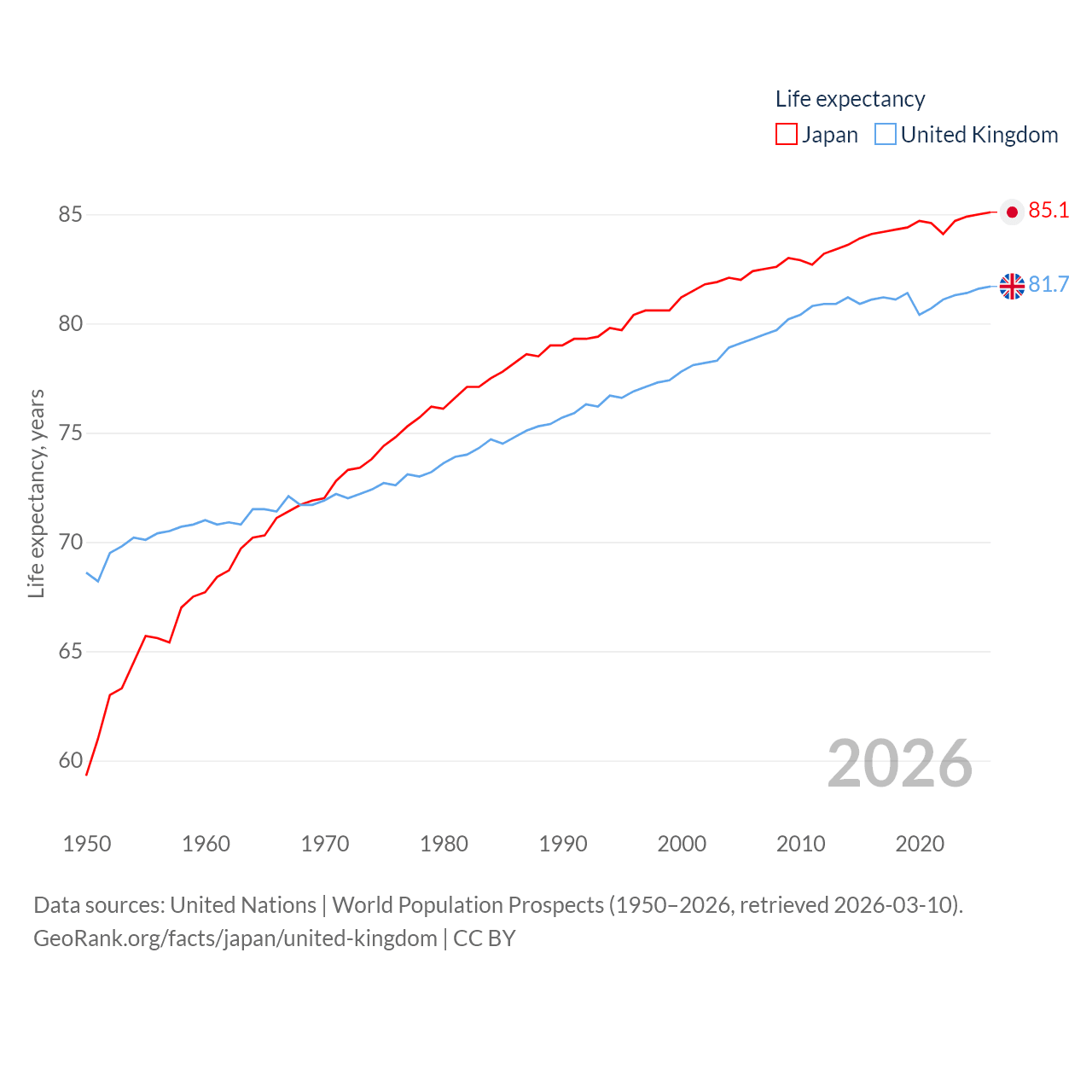 By GDP, Japan ranks 4/197 ($4.03T) and The United Kingdom ranks 6/197 ($3.69T). By GDP per capita, Japan ranks 38/197 ($32,487), while The United Kingdom ranks 22/197 ($53,246).