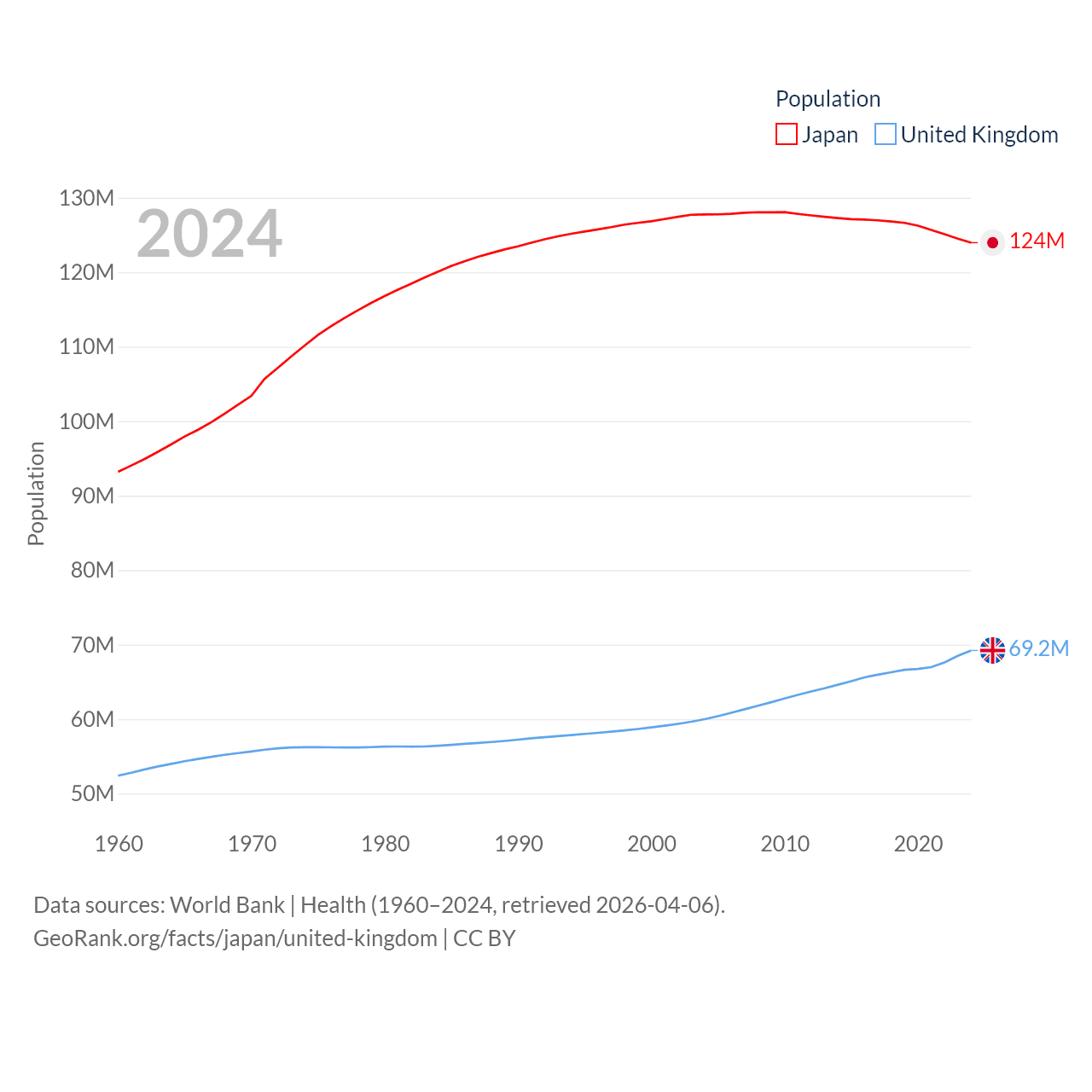 Japan has a population of 124M (ranked 12/197), compared with 69.2M in The United Kingdom (ranked 21/197). Japan's land area is 140,761 sq mi versus 93,410 sq mi for The United Kingdom (ranked 61st vs. 78th).