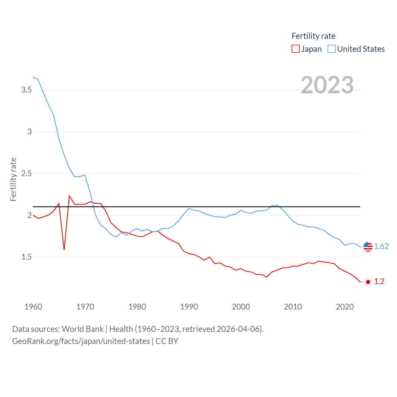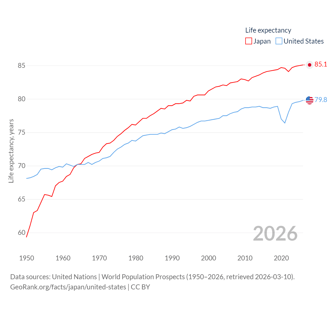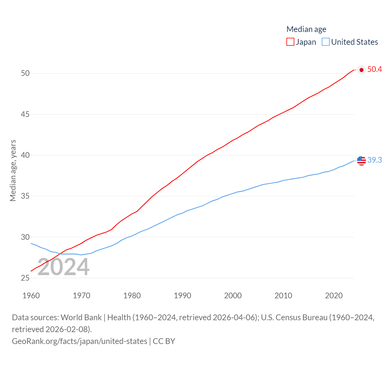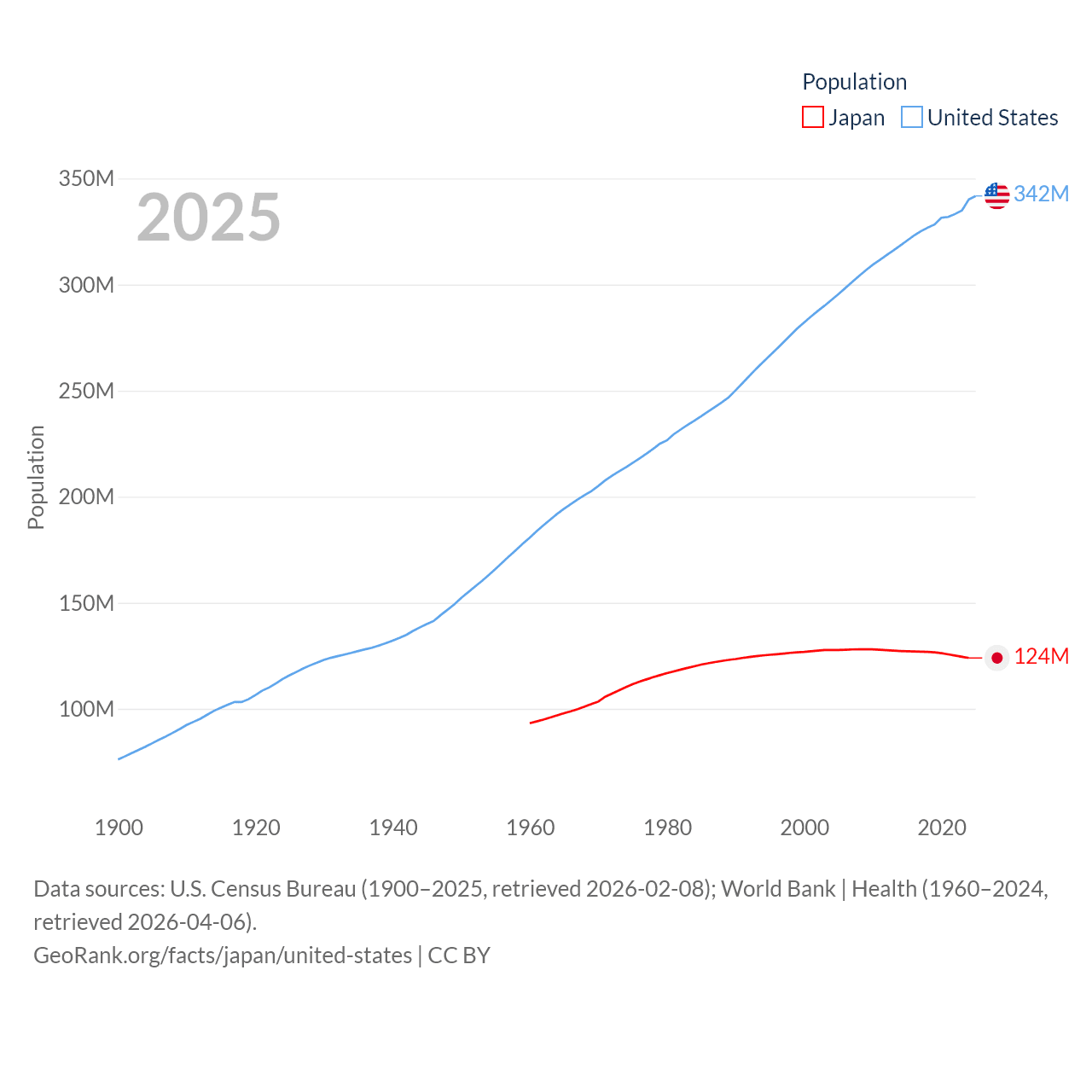 Japan has a population of 124M (ranked 12/197), compared with 342M in The United States (ranked 3/197). Japan's land area is 140,761 sq mi versus 3,531,839 sq mi for The United States (ranked 61st vs. 3rd).
